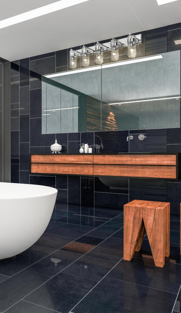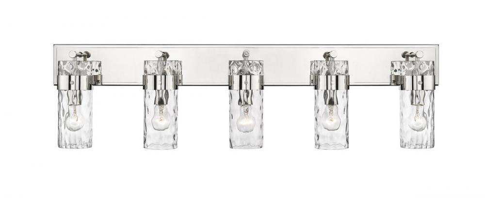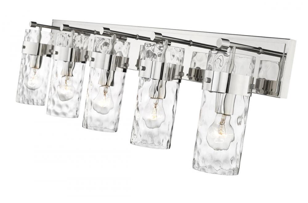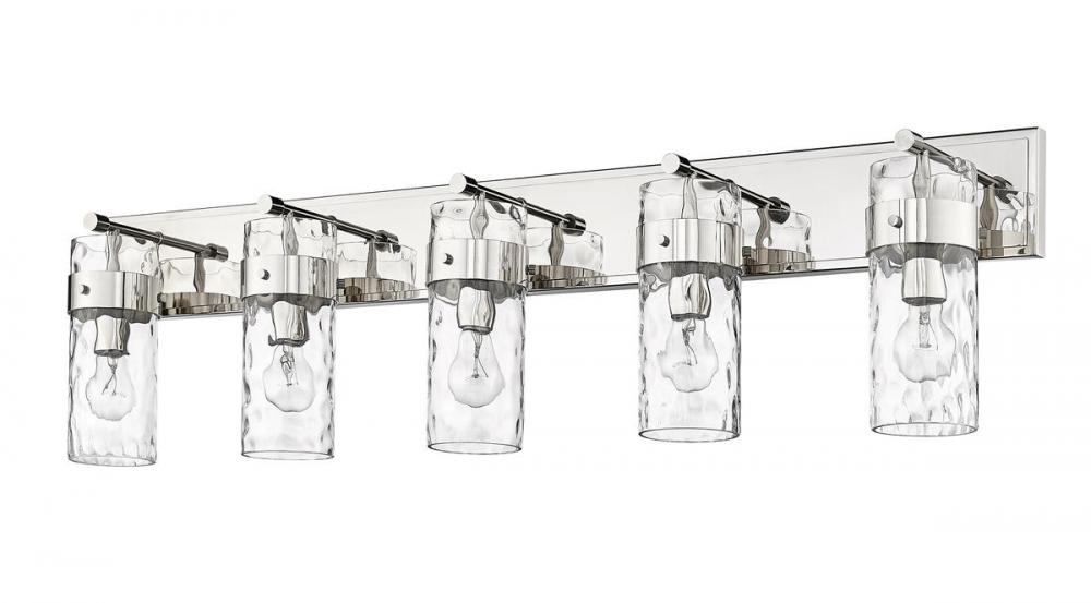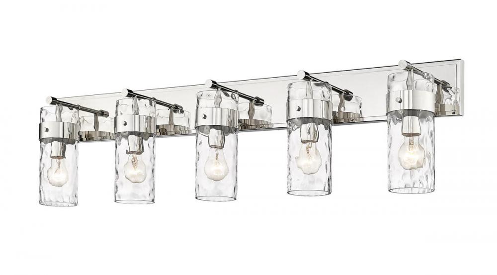 This five-light vanity fixture in polished nickel will add a warm and inviting glow to bathrooms and hallways. It is made of steel with a glass shade that boasts a ripple texture that catches the eye.