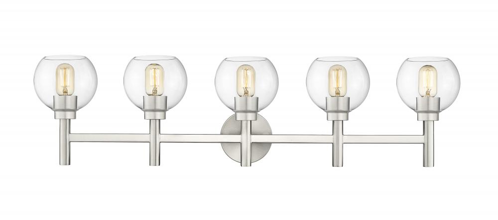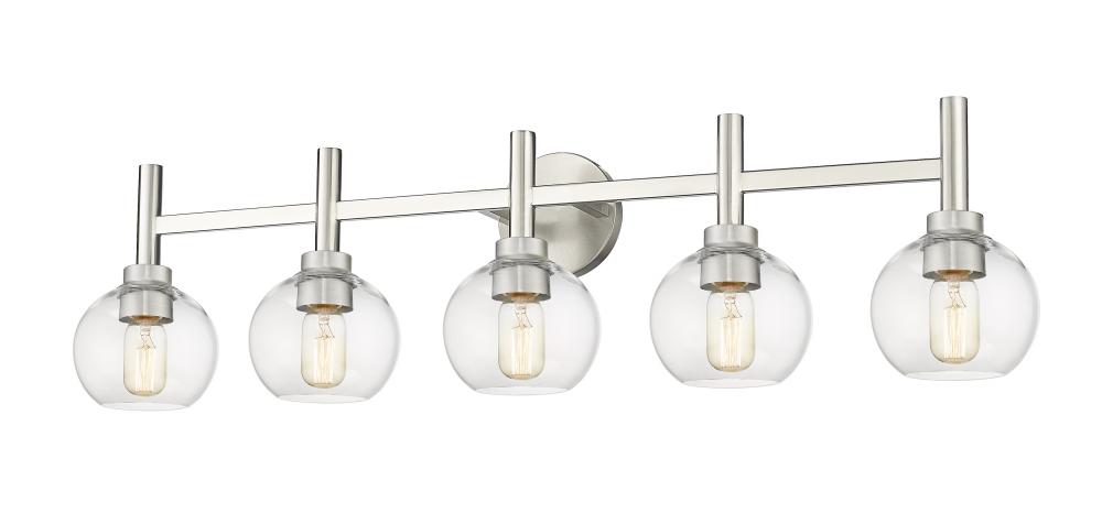 Span a graceful double vanity space with the exacting precision of a modern five-light vanity wall light. Designed inspirations come from the perfect form of a circle, comprised of open-edged globe shades in clear glass. Torch-style framework and a round wall plate are crafted in steel and receive a bright brushed nickel finish for timeless elegance.