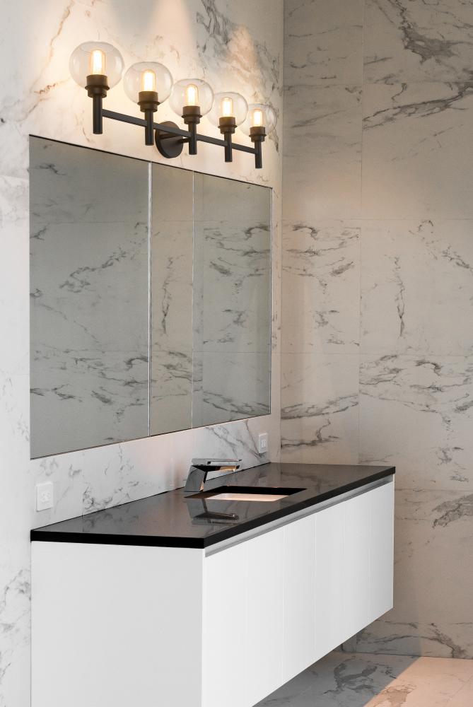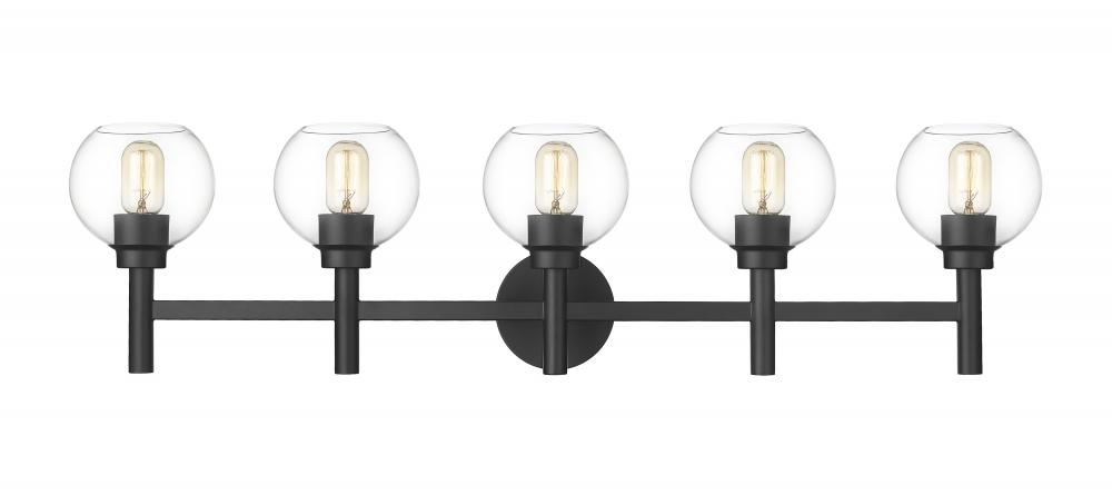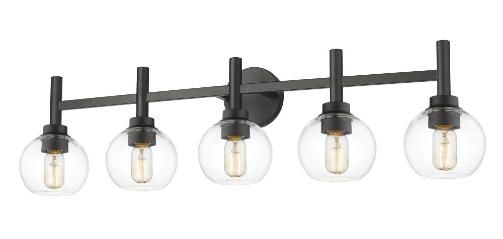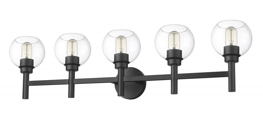 Span a graceful double vanity space with the exacting precision of a modern five-light vanity wall light. Designed inspirations come from the perfect form of a circle, comprised of open-edged globe shades in clear glass. Torch-style framework and a round wall plate are crafted in steel and receive a contrasting matte black finish for timeless elegance.