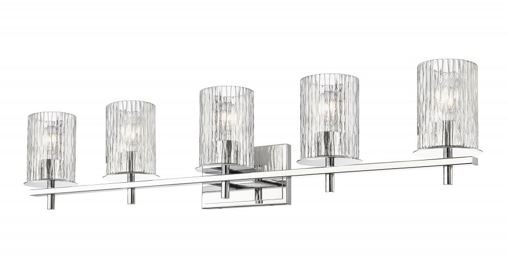 Spacious bathrooms benefit from the extra-wide build and stunning style motif of this modern five-light vanity light. Intricate detail is textural and artisan with clear glasswork in a cylinder shape, with an inner white diffuser. Etched opal and clear glass blend as they enhance brilliant chrome finish framing and show off a crisp mix of circles and lines.