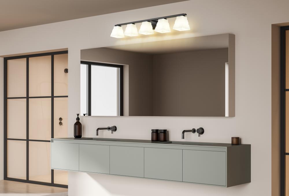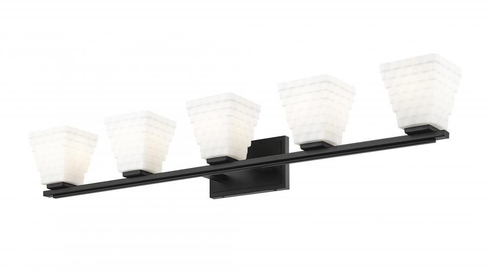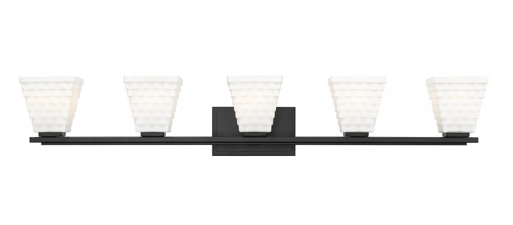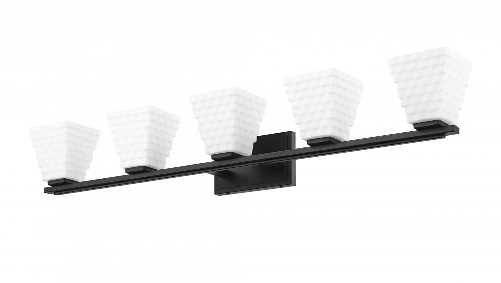 Compelling black and white introduces character and contrast to this modern five-light vanity bath light. It centers on five shades, each with a tapering square silhouette crafted from stacked opal glass that creates an eye-catching layered design perfect for sophisticated spaces. Its backplate and arm add layered intricacy, offering subtle sophistication in a primary or guest en suite.