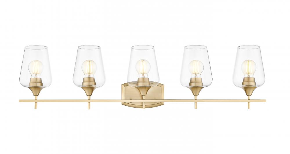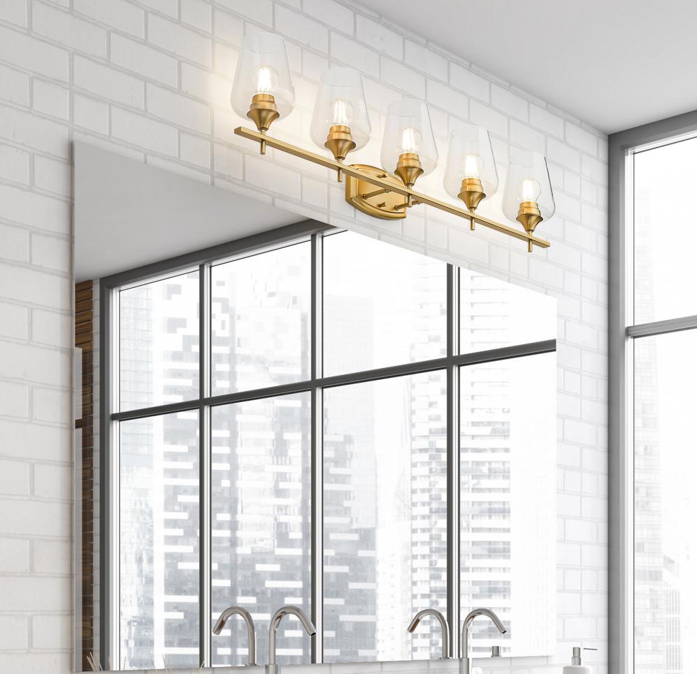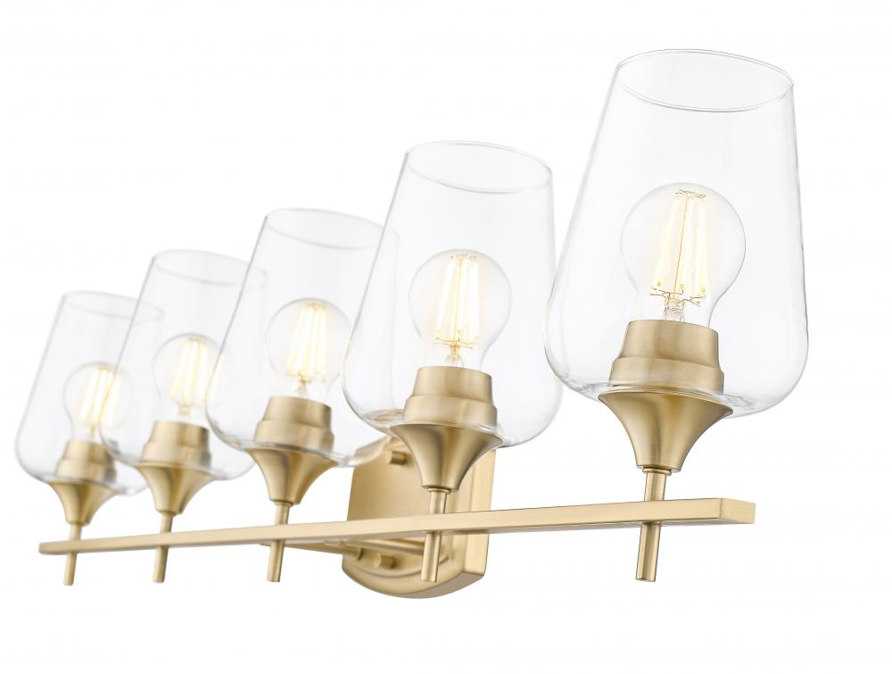 Larger master or guest bath spaces play host to a five-light vanity light oriented to delicate sophistication. Beautiful burnished brass finish steel construction forms a linear frame and shapely wall plate, aligning five sparkling clear glass goblet shades filtering dimmable lighting suited to creating a more functional bathroom or dressing space.
