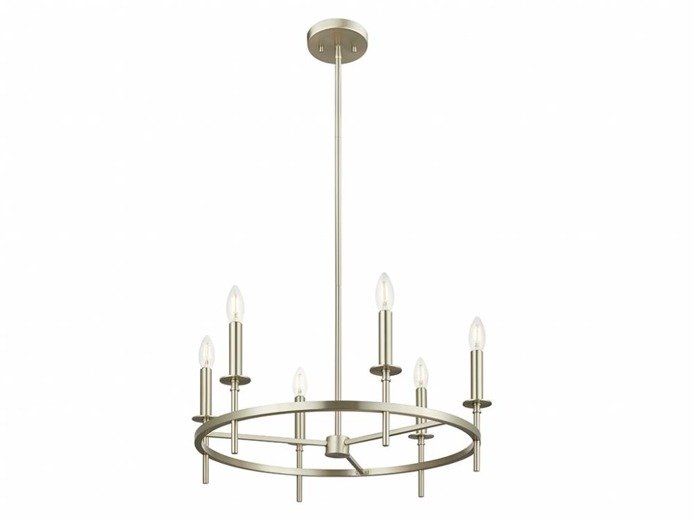 Discover an elegant lighting look with this 6-light chandelier. It showcases an understated style accentuated by stylized bobeches and is dressed in a Brushed Nickel finish. It is 9" in height and 25" in width. Uses six candelabra size bulbs of up to 60 watts per bulb. Bulbs not included.