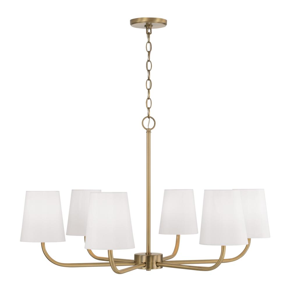 Embodying true minimalist form, the Brody Chandelier brings sleek, simplified style. The Aged Brass finish enhances the classic look of the white fabric shades to deliver sophisticated, less-is-more design. Available in two sizes.