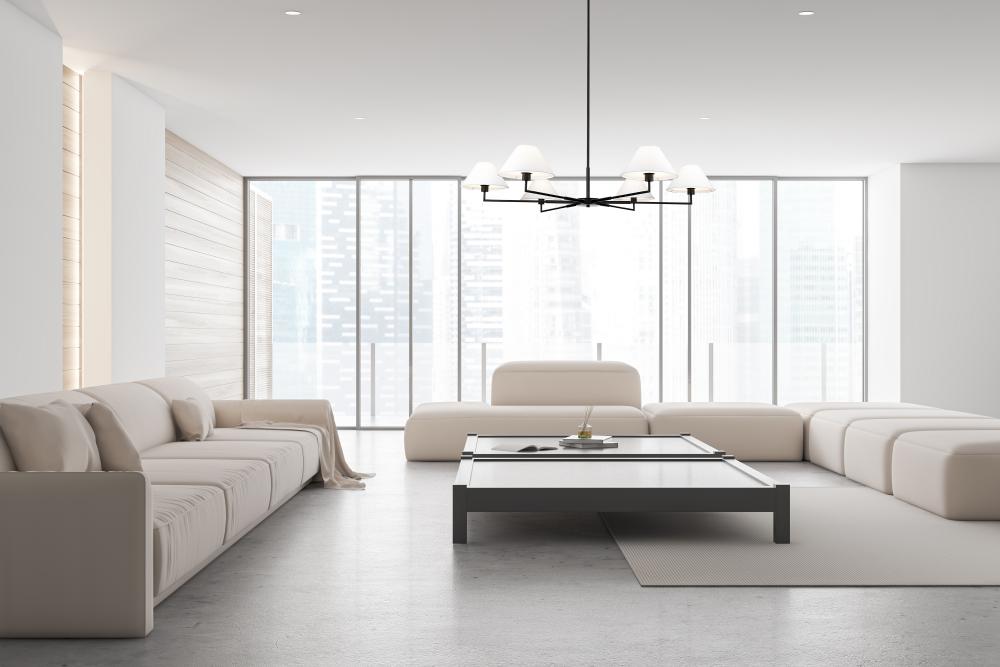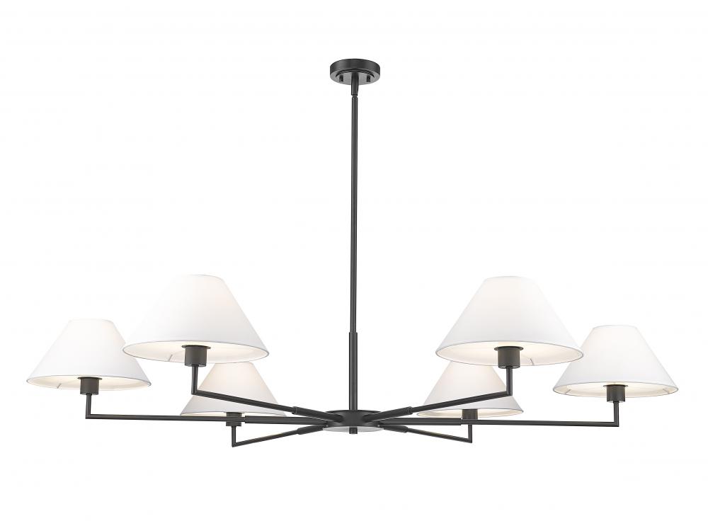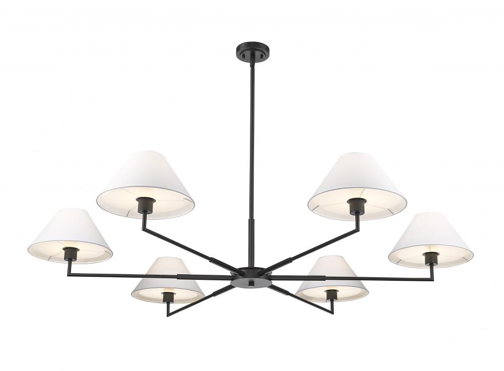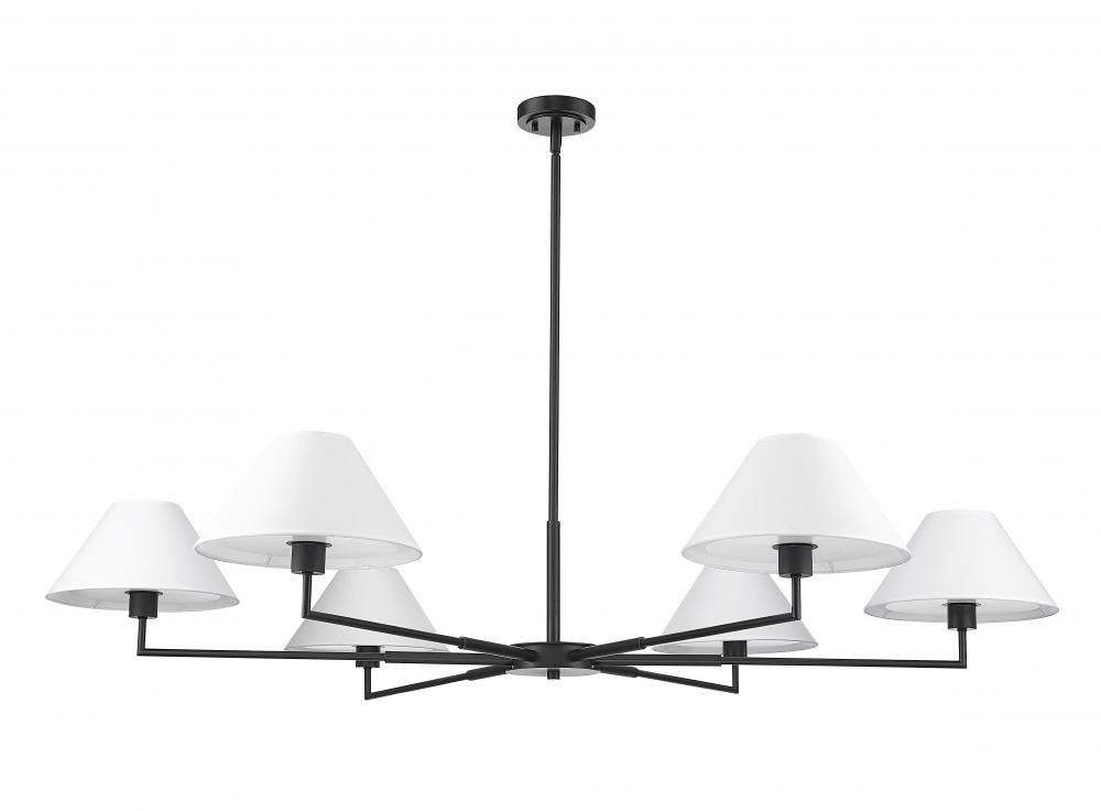 Surrounding decor is instantly elevated with the sleek simplicity of a stylishly modern, wide six-light chandelier. In a cool matte black finish, this delightful fixture is a flexible option everywhere from your dining room to a master suite, casting warm, bright illumination while instilling radiant elegance. Its six lights are complete with empire shades for a classic touch updated with white linen for light, bright ambiance.