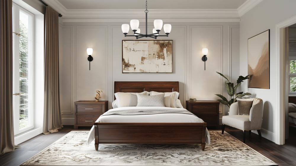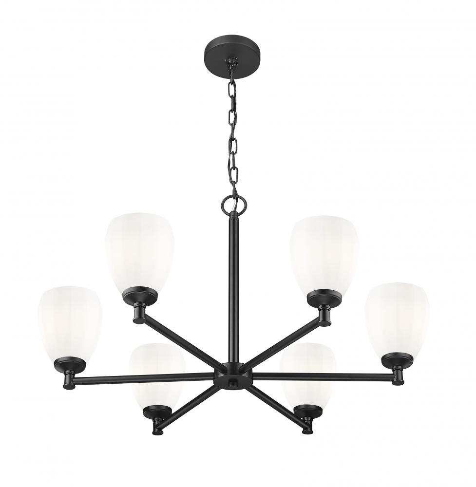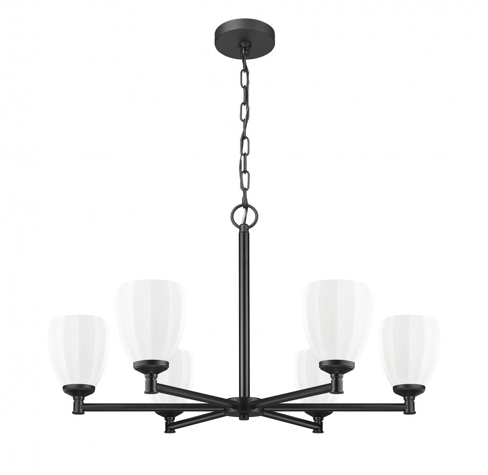 Brighten your entry or dining room with the understated style of a modern classic six-light chandelier. In matte black, it delivers rich contrast and depth while offers bright, diffused illumination. Shades evoke tulips, complete with faceted details that add unique character to their matte opal glass construction.