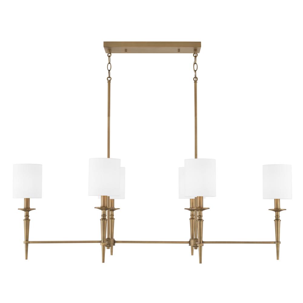 Straight edges and ornate candlestick detailing layers of drama to the Abbie 6-Light Island. The Aged Brass finish brings a glamourous nod to this updated design.