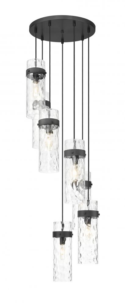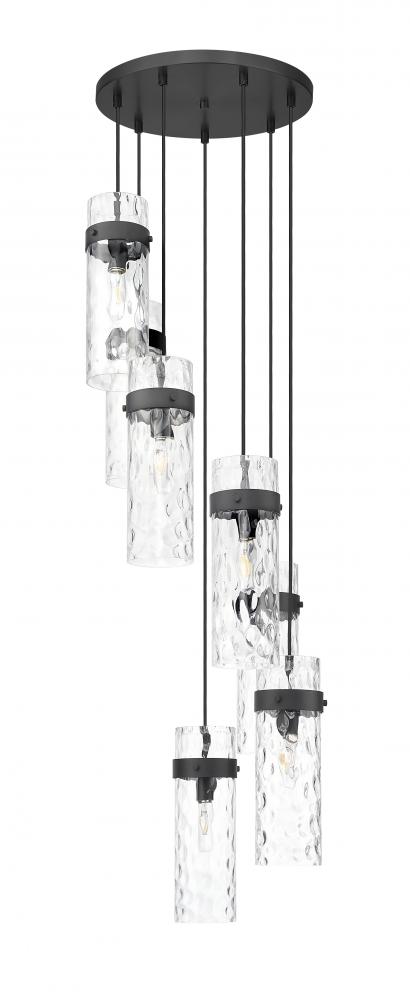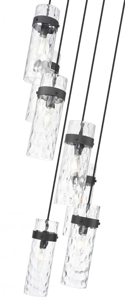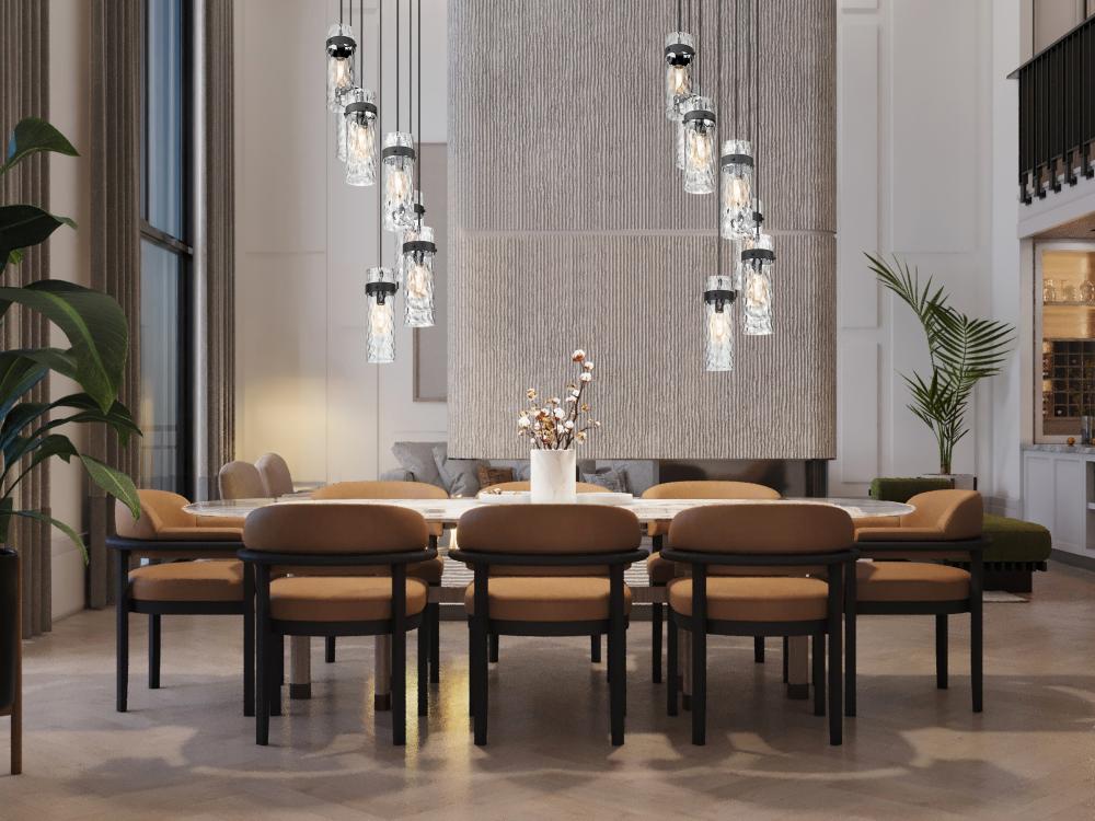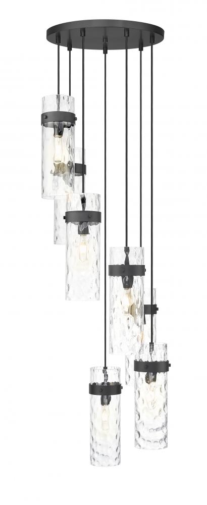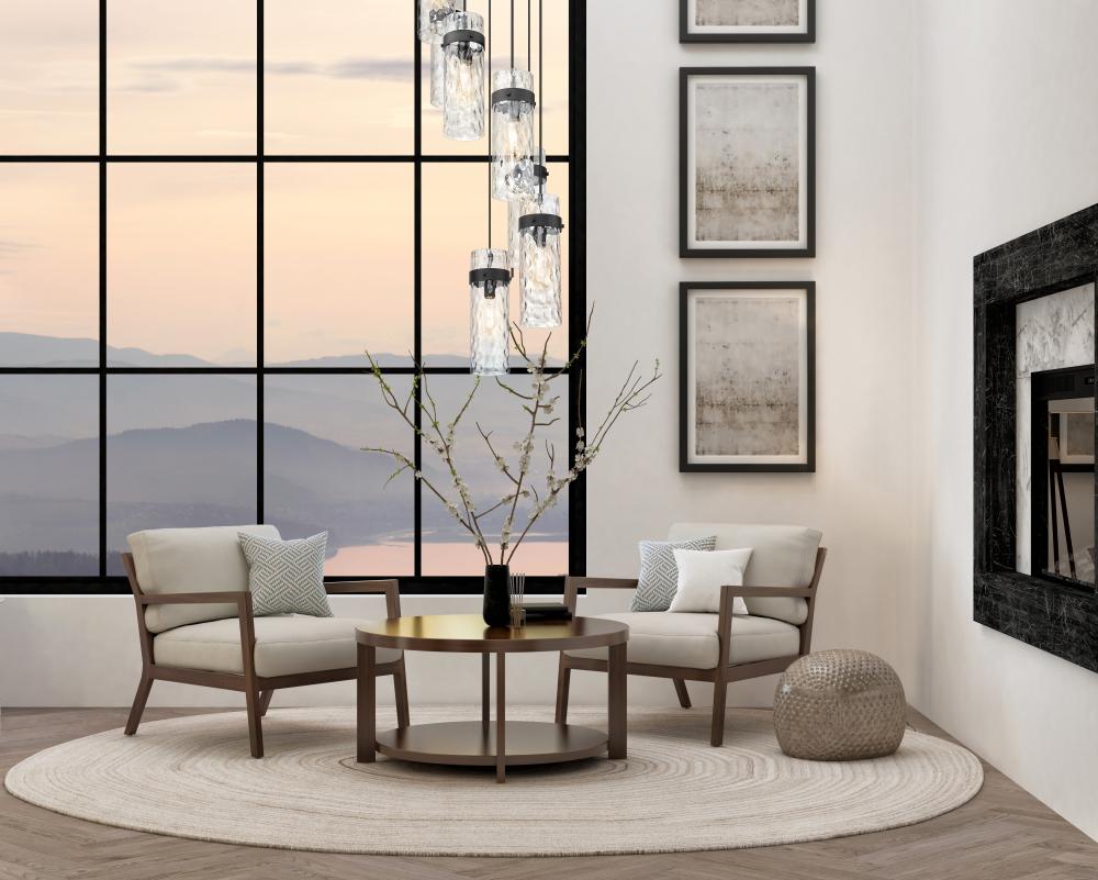 Upgrade your dining room or staircase with the refined opulence of this modern seven-light chandelier. From the Fontaine collection, it boasts a matte black finish over a round canopy and metal collars, creating rich depth and contrast in your living or dining room. Its cylindrical shades show off clear water glass, offering a rippled effect perfect for sophisticated spaces.