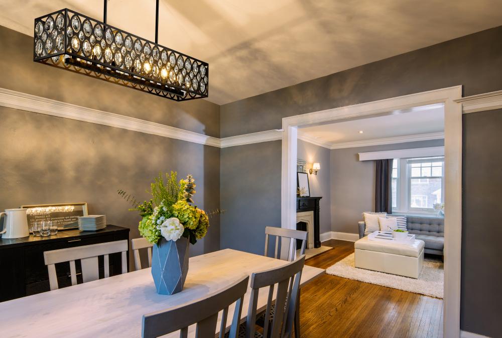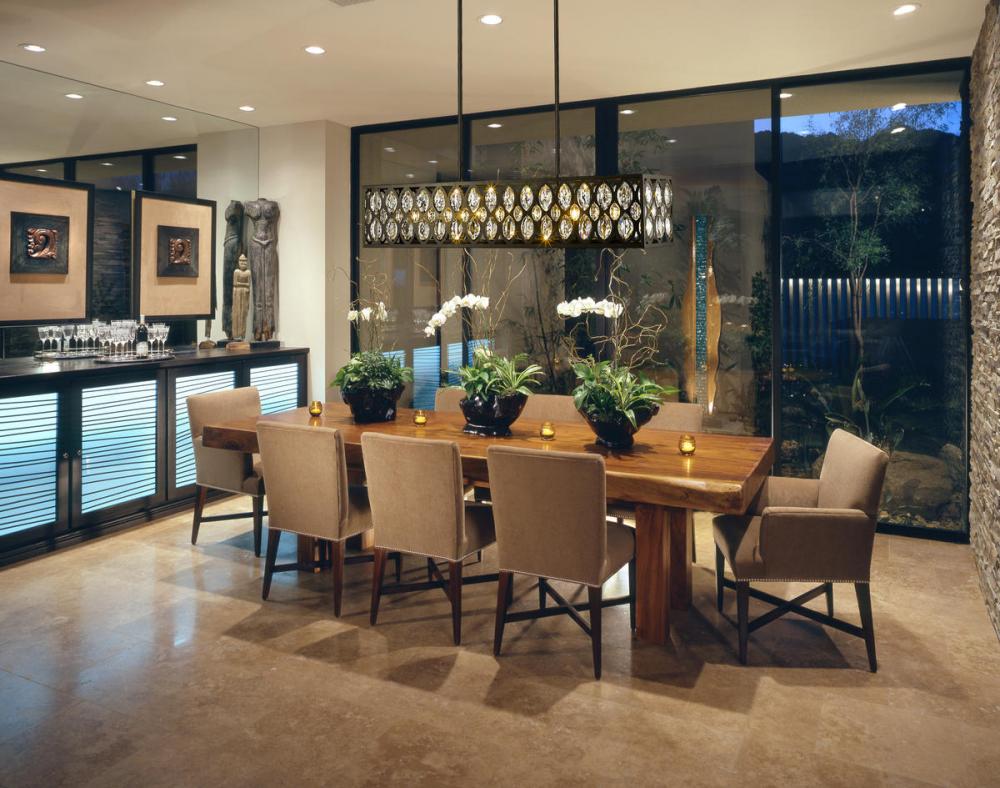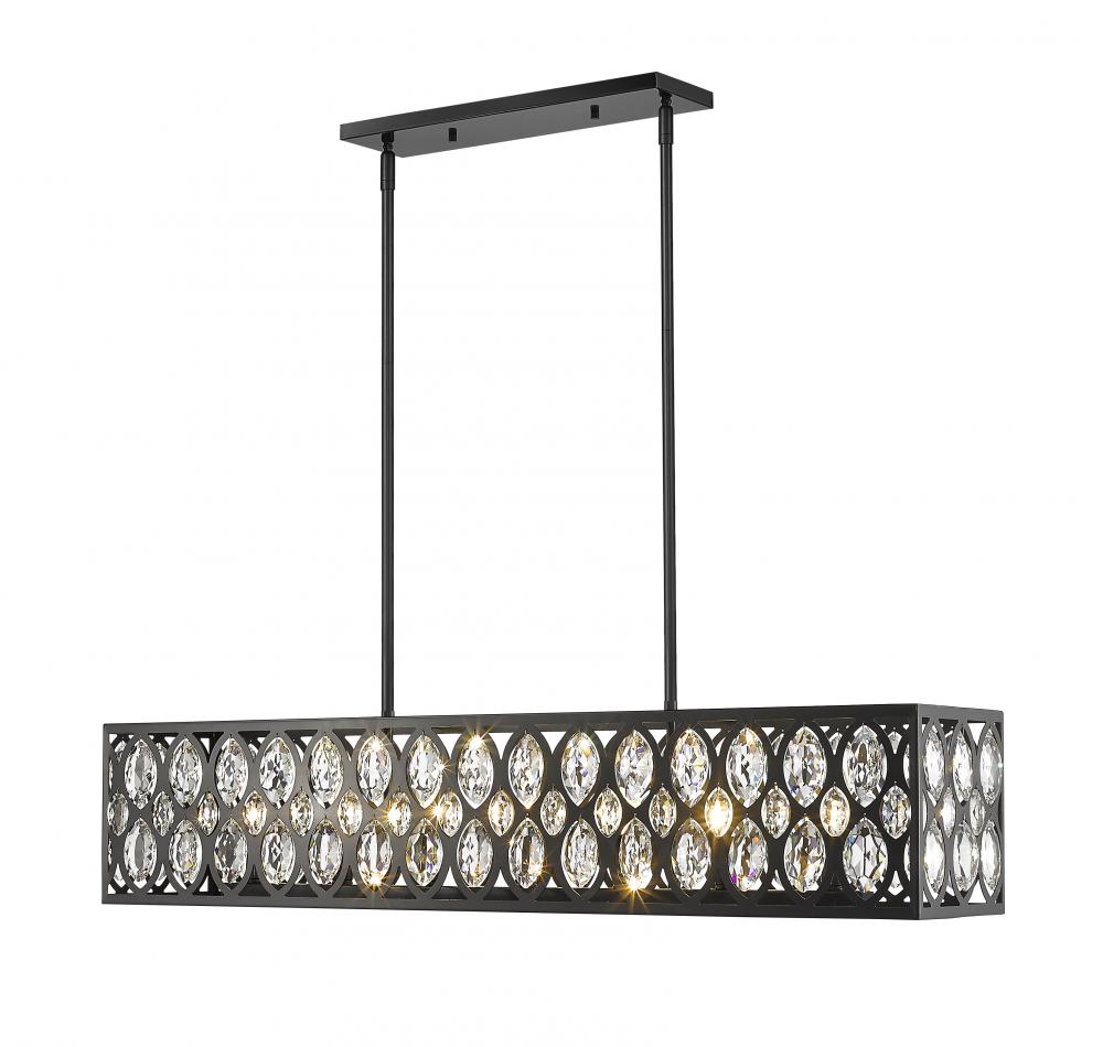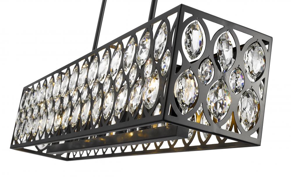 From the Dealey collection comes this contemporary seven-light chandelier, featuring a box-like rectangular design and held by two rod supports. Its elegant steel shade is punched with an ellipse-style motif, each set with a glimmering clear crystal pendant that adds stark contrast against the dark matte black finish. With an elongated shape, this chandelier spreads a warm, even glow across a wide dining table or along a hallway, adding a touch of glamour as well.