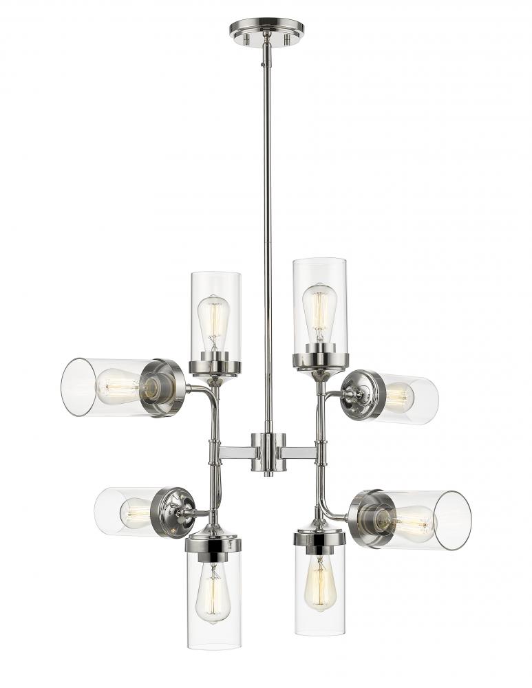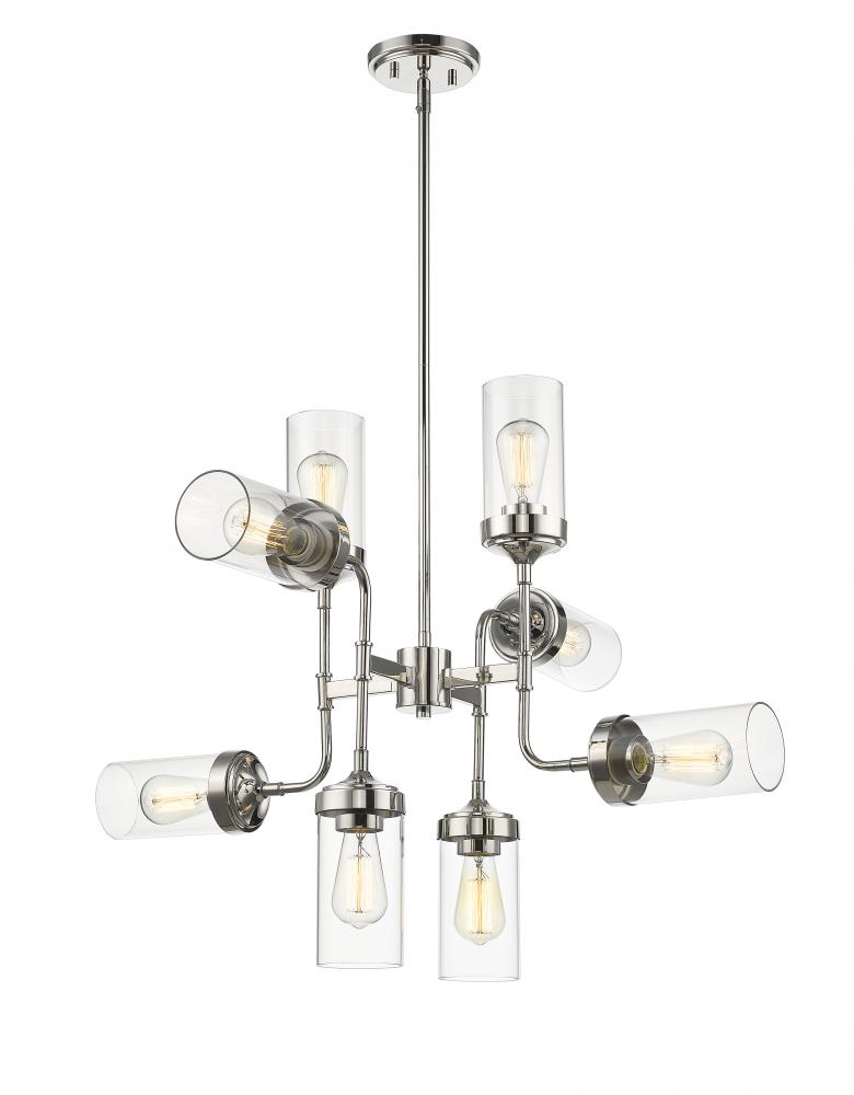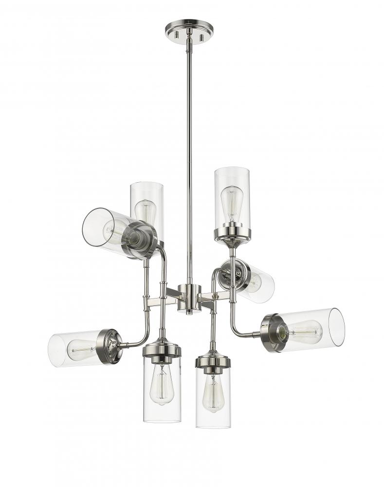 Complete the cheeky urban look of a custom dining ensemble with this eight-light pendant. With a stunning polished nickel finish steel frame, its hardware-inspired character receives a beautiful enhancement from cylindrical clear glass shades.