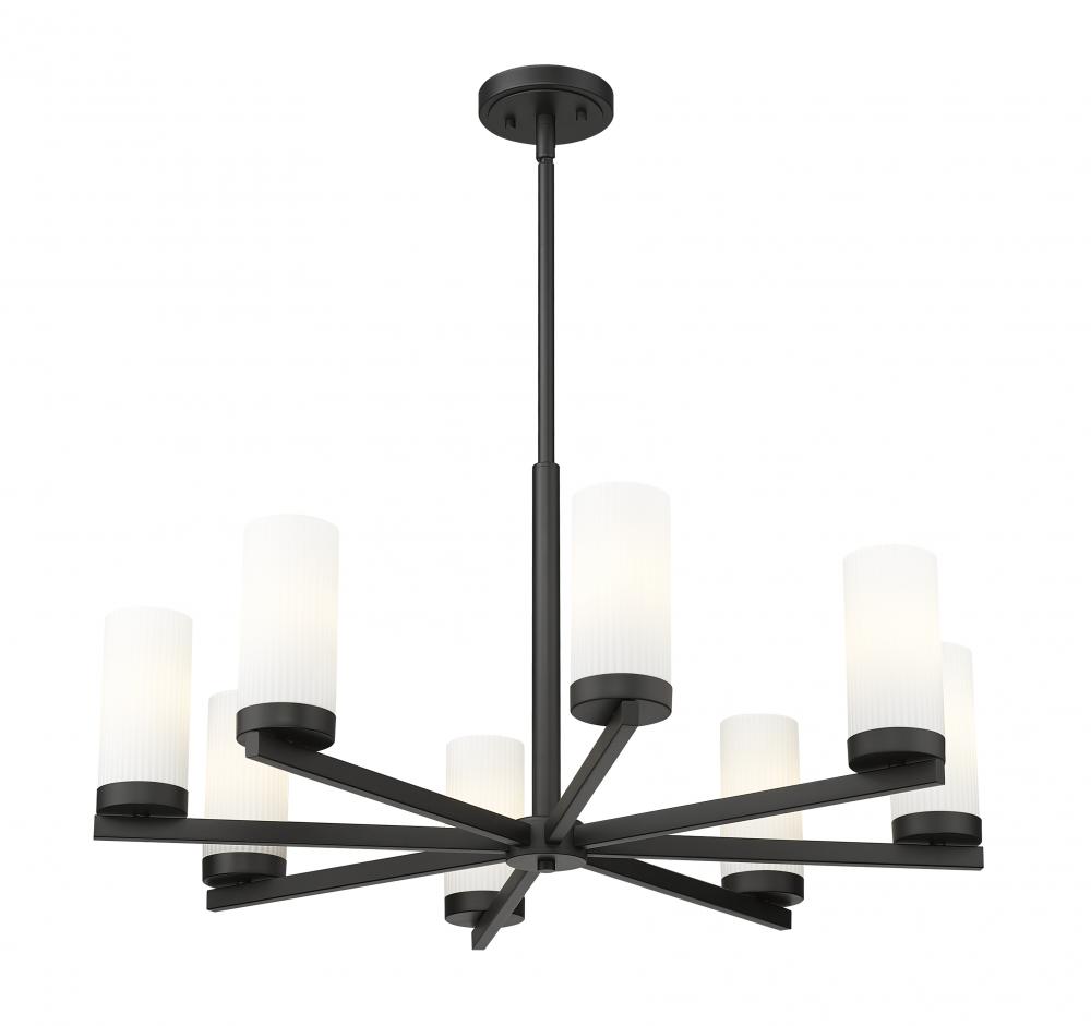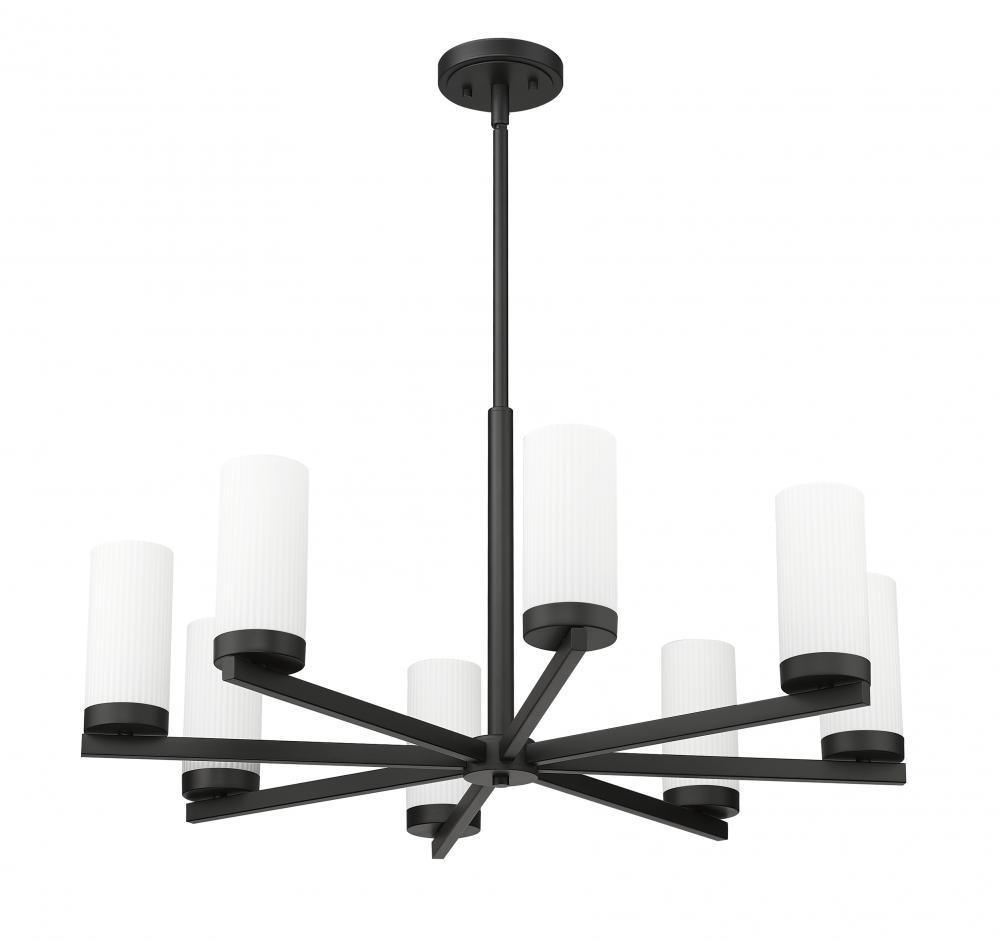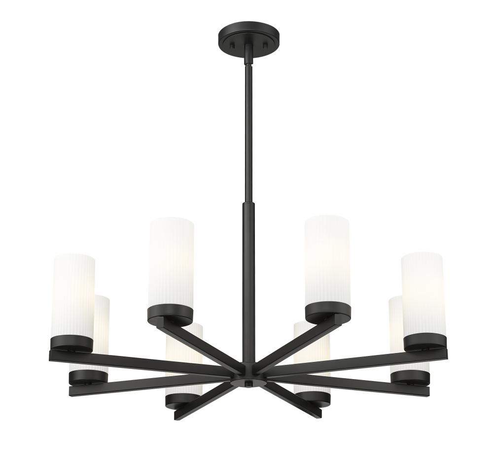 Sleek style infuses the compact profile of a modern eight-light chandelier. Radial arms are capped with cylinders of white glass while a matte black finish creates crisp contrast. A chic choice over a dining table or entryway, it sets an inviting tone with warm, inviting illumination.