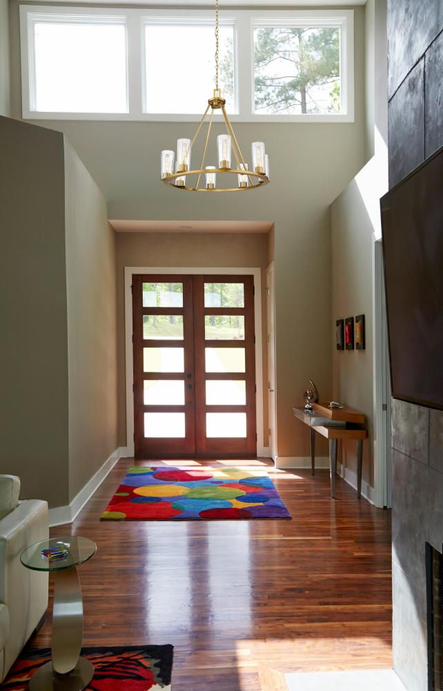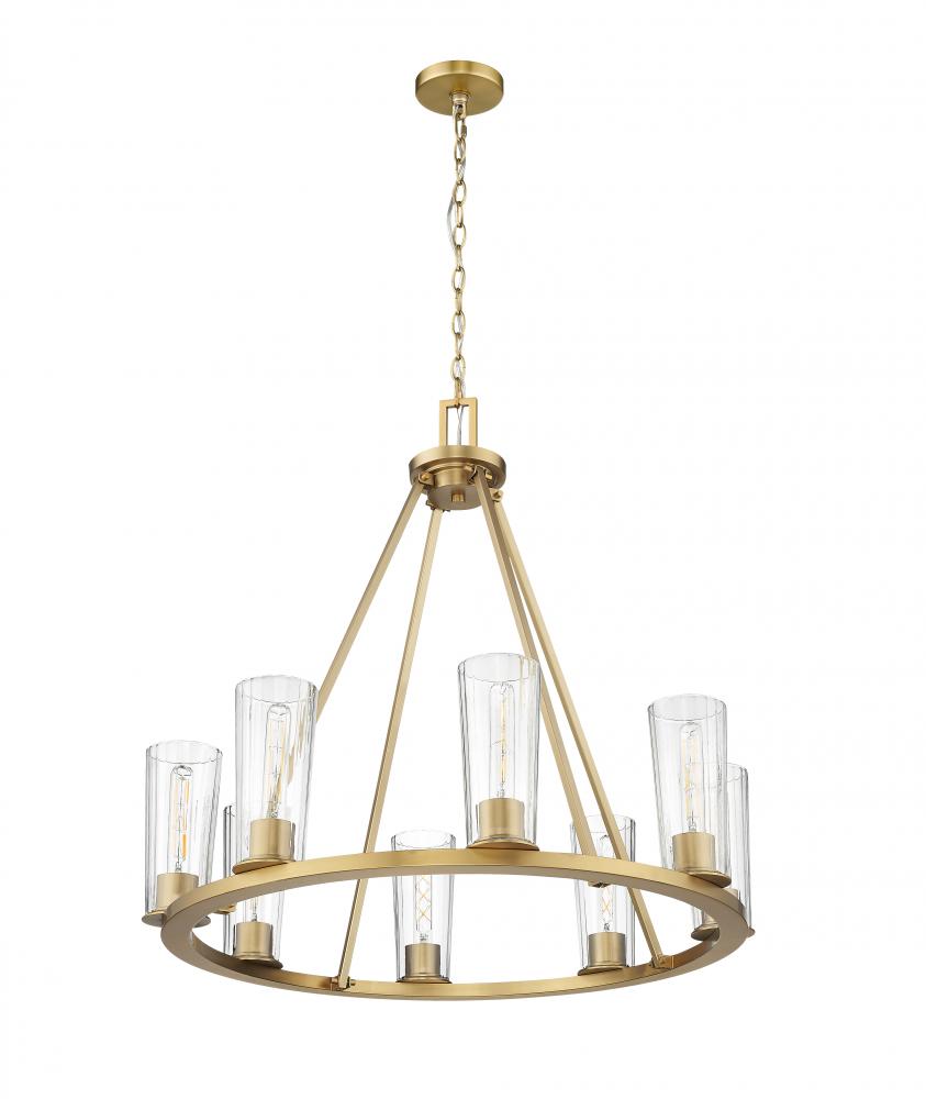 Add distinction to your foyer or dining room with a modern industrial eight-light chandelier. The ring silhouette offers timeless appeal, while bright illumination filters through tapered clear glass shades. Its modern gold finish lends a sophisticated touch, while tubular bulbs are the right dose of vintage allure.