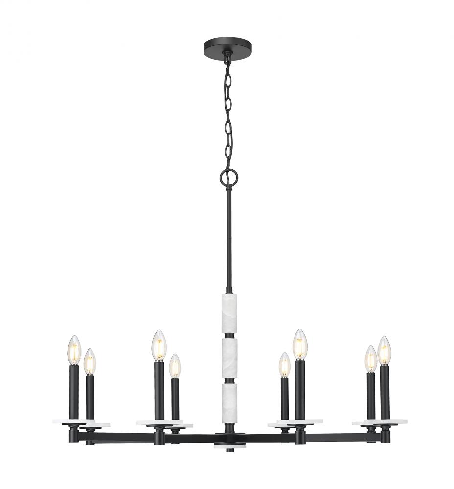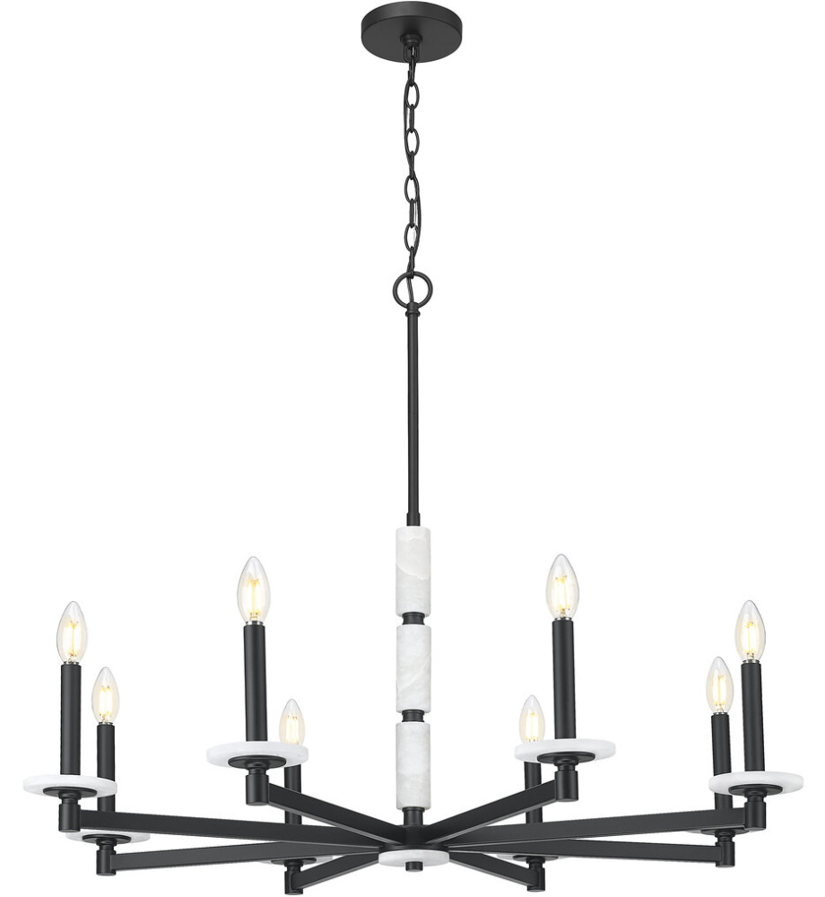 This chandelier brings bold elegance to the heart of the room. Eight alabaster spheres circle a matte black frame, offering contrast and glow in perfect measure. With its sculptural layout and soft light, it?s made to captivate.