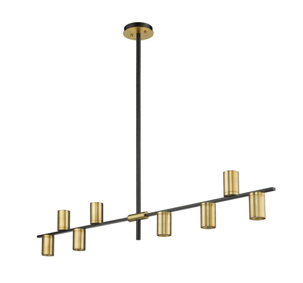 Repurposing a storied Native American tribal motif, the Calumet eight-light island and billiards light completes a dynamic design scheme in an entertaining space. Both contemporary and transitional elements follow the industrial-inspired look of a geometric silhouette crafted of matte black finish steel with cylindrical olde brass finish steel shades. With lighting in both directions, this fixture is ideal for any space.