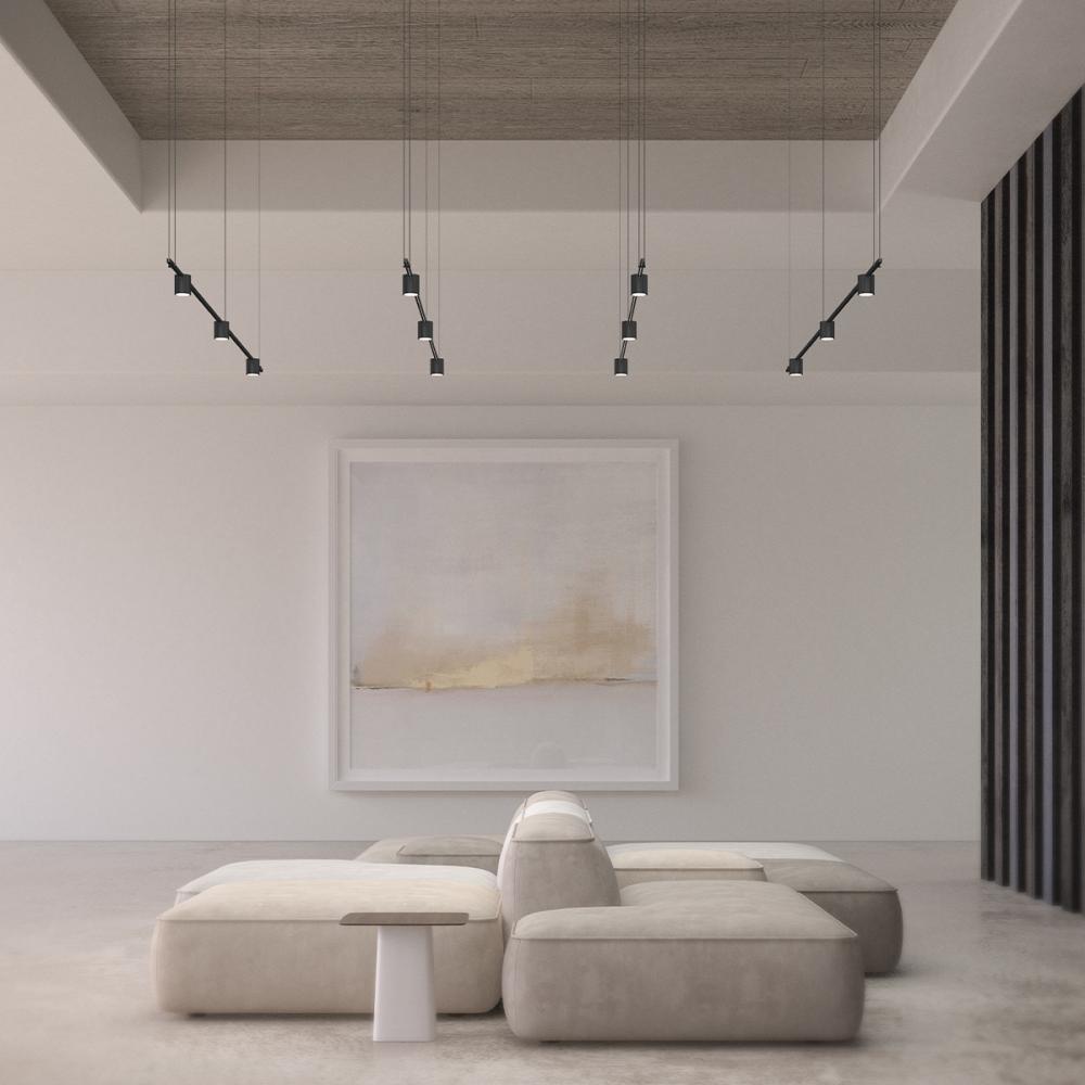 Floated below a ceiling atrium, linear Power Bars with Power Precise Direct Mount Cylinders define the symmetrical geometry of the space (4 units of this product are shown).