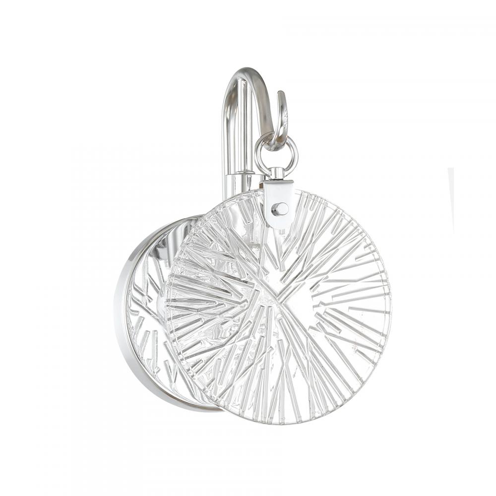 It is often said that lighting is the jewelry of the home. With its fun hook-style arm that holds a flat, round, starburst clear glass shade, the Savoy House Addison 1-light sconce is a great example of this saying. The backplate is finished in Chrome and mimics the shape of the glass shade. Addison is 9" in height, 5.75" in width and extends 5.5" from the wall. Uses one candelabra size bulb of up to 60 watts. The bulb is not included. This sconce is damp area rated and must be installed as shown.