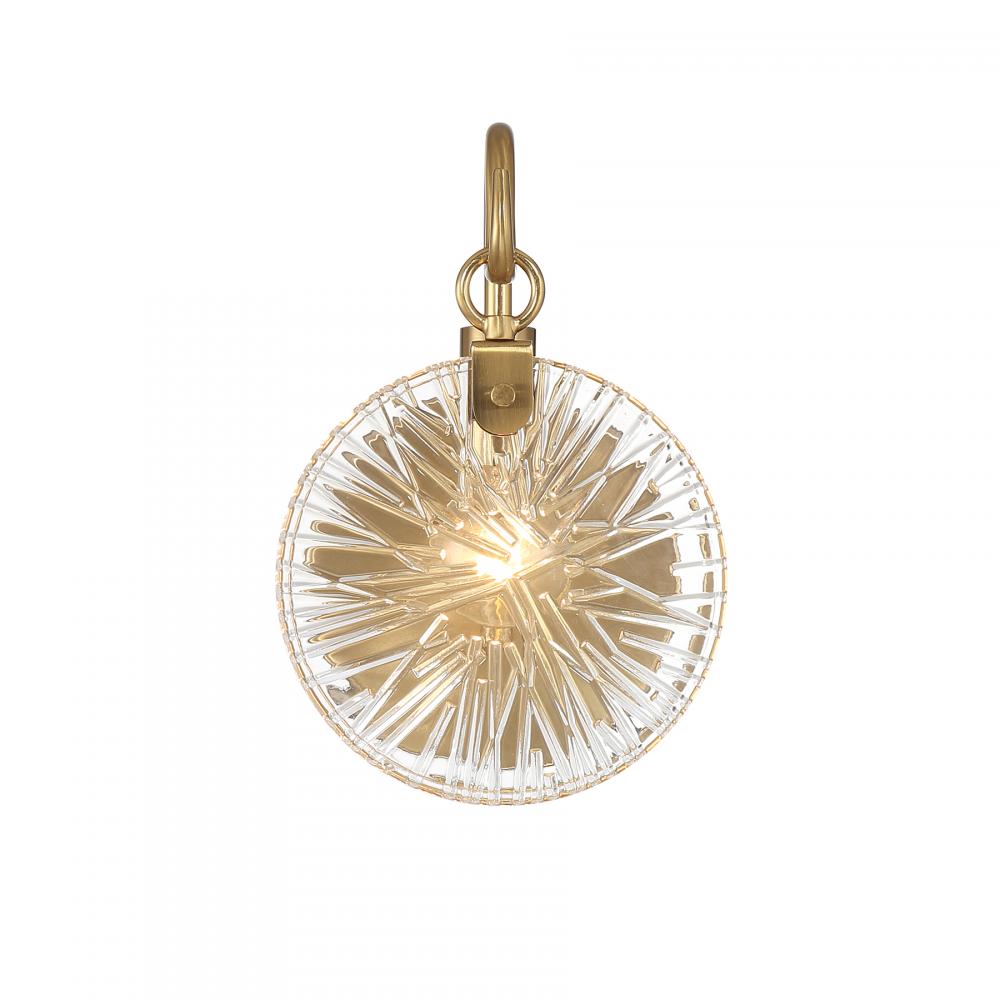 It is often said that lighting is the jewelry of the home. With its fun hook-style arm that holds a flat, round, starburst clear glass shade, the Savoy House Addison 1-light sconce is a great example of this saying. The backplate is finished in Warm Brass and mimics the shape of the glass shade. Addison is 9" in height, 5.75" in width and extends 5.5" from the wall. Uses one candelabra size bulb of up to 60 watts. The bulb is not included. This sconce is damp area rated.