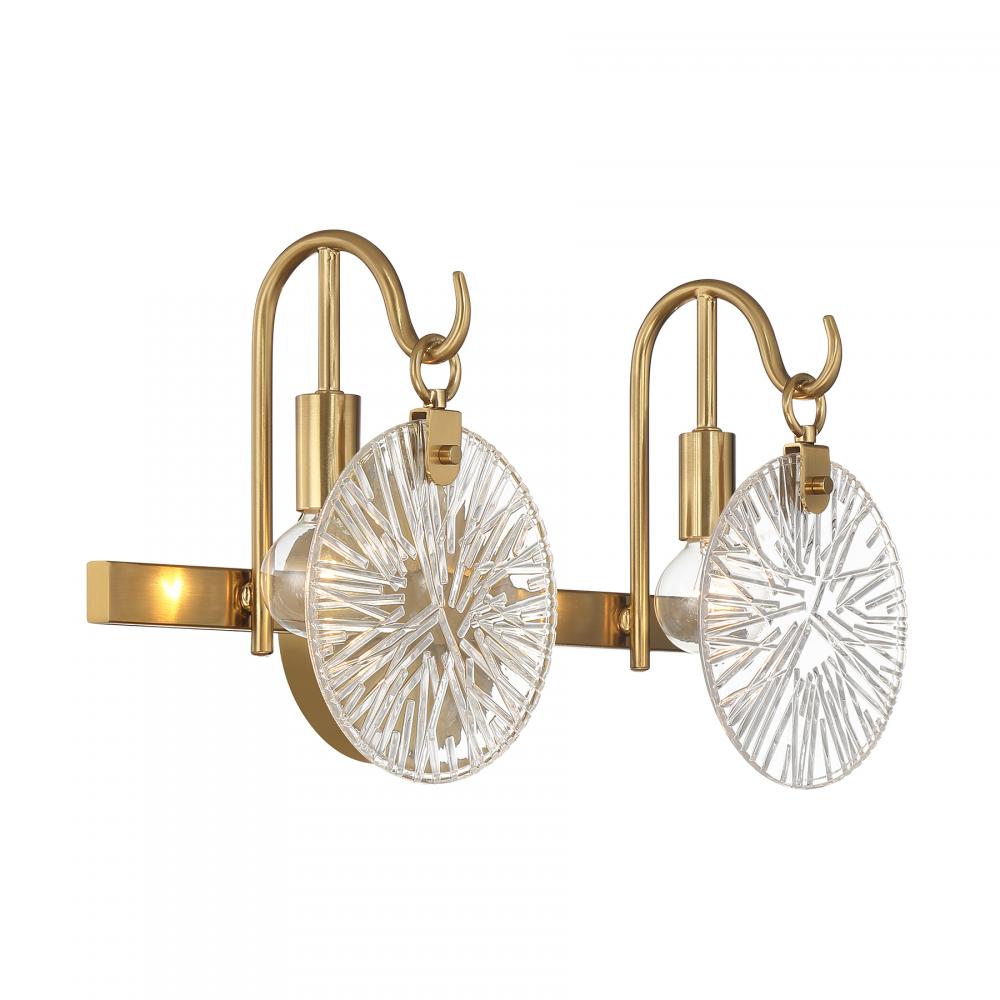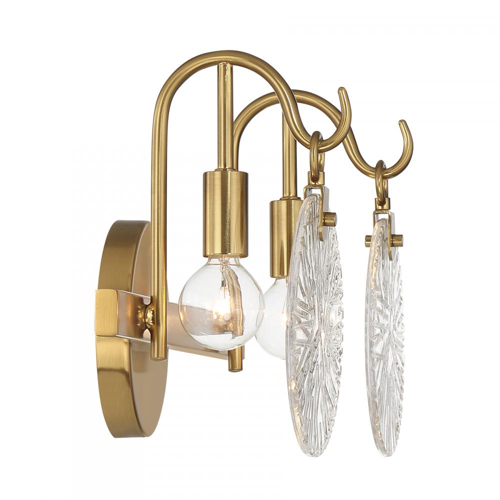It is often said that lighting is the jewelry of the home. With its fun hook-style arms that hold flat, round, starburst clear glass shades, the Savoy House Addison 2-light bath light is a great example of this saying. The backplate is finished in Warm Brass and mimics the shape of the glass shades. Addison is 9" in height, 16" in width and extends 6.5" from the wall. Uses two candelabra size bulbs of up to 60 watts per bulb. Bulbs not included. This bath bar is damp area rated and must be installed as shown.