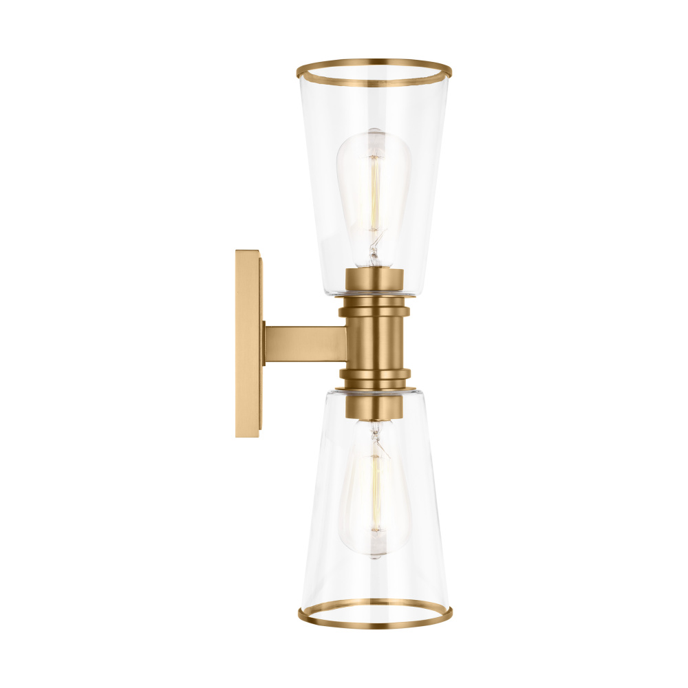 Designed by Chapman & Myers, the Alessa two light wall sconce in polished nickel is a Simple glass bathroom collection with rectangular metal arms and tapered clear glass shades. The conical clear glass shades replicate and frame the shape of the inner filament bulb. Each shade is supported by a rectangular metal arm and is capped with a thin metal rim.