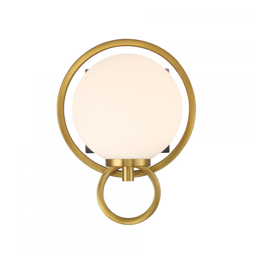 Art Deco style is reinvented in this chic Savoy House Alhambra 1-light sconce. An orb of soft frosted glass held on a slender arm sits in front of a square backplate accentuated by two circles that frame the glass beautifully. A Matte Black and Warm Brass finish makes the perfect pairing. This sconce is 10.25" in height, 7.75" in width and extends 7" from the wall. Uses one candelabra size bulb of up to 60 watts. Bulb not included. This sconce is damp area rated and must be installed as shown.