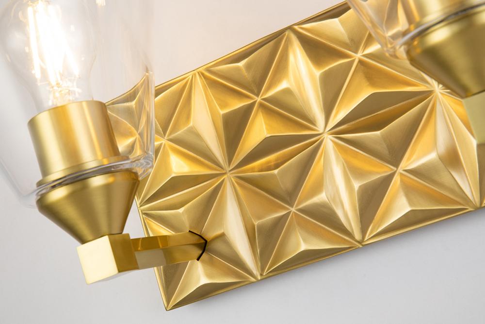 A 15.5" textured rectangle backplate sconce in aged brass with two cone-shaped clear shades. Mounts up or down, offering modern elegance and texture to any room.