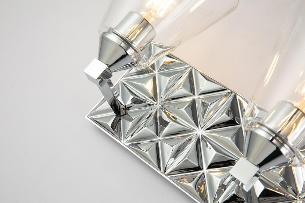 A 24.5" textured rectangle backplate sconce in polished chrome with three cone-shaped clear shades. Mounts up or down, blending modern elegance and texture for any space.