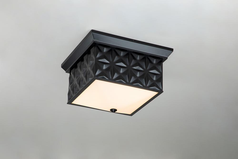 Create drama with this 14.5" square matte black flush mount. Bold design merges tradition and edge. Damp-rated, with creamy white glass for a sleek, soft glow.