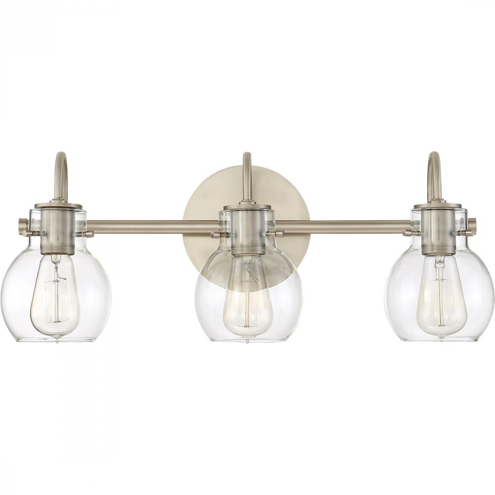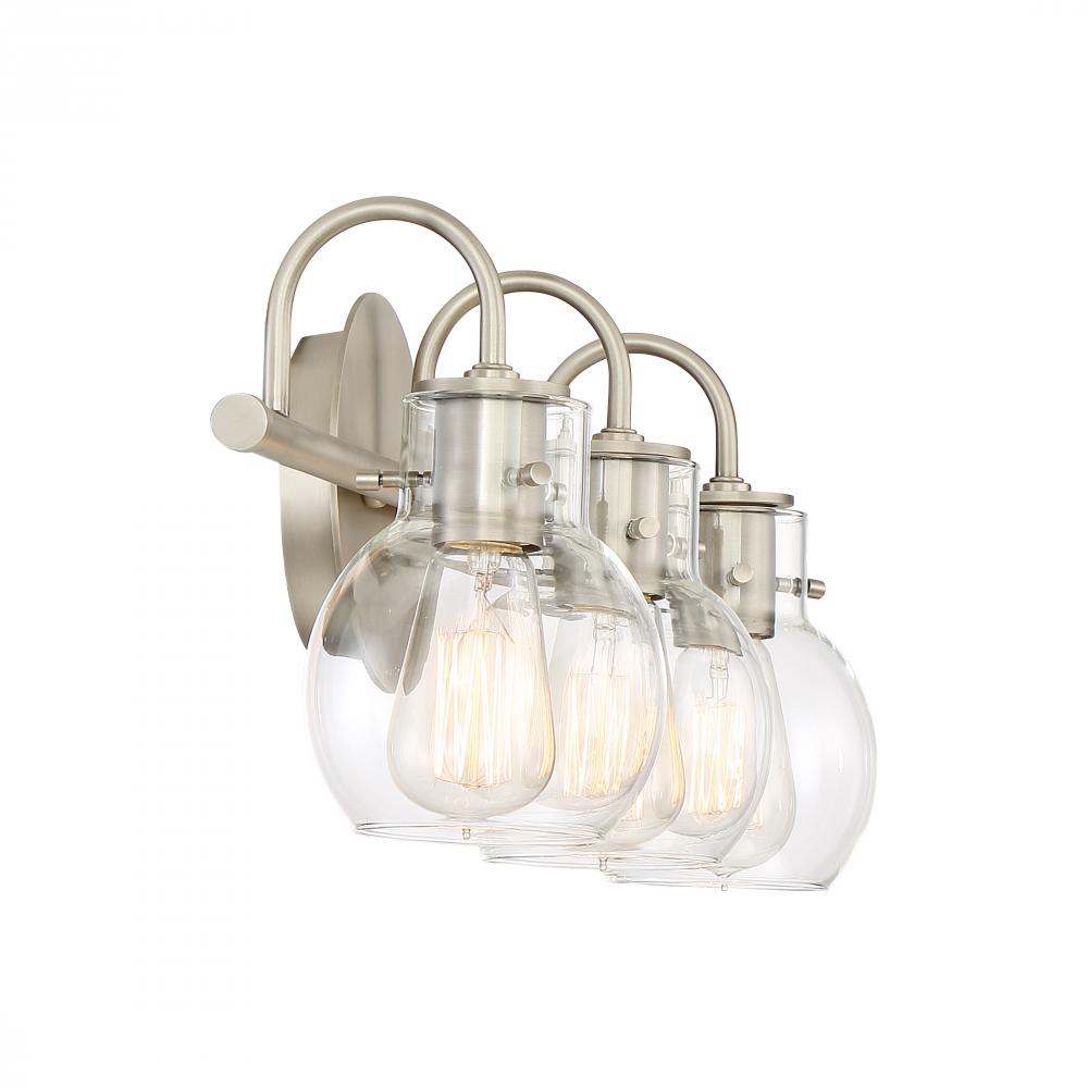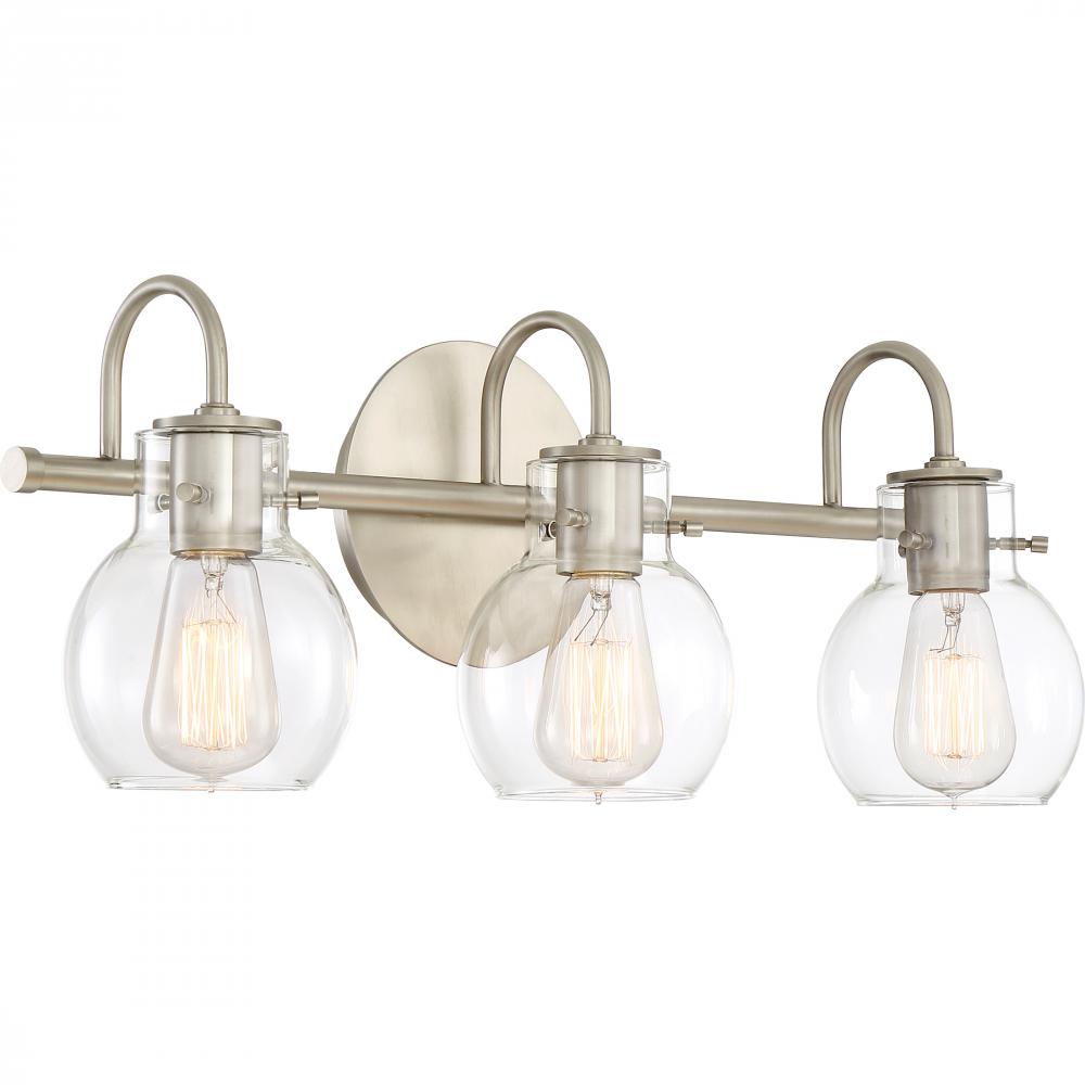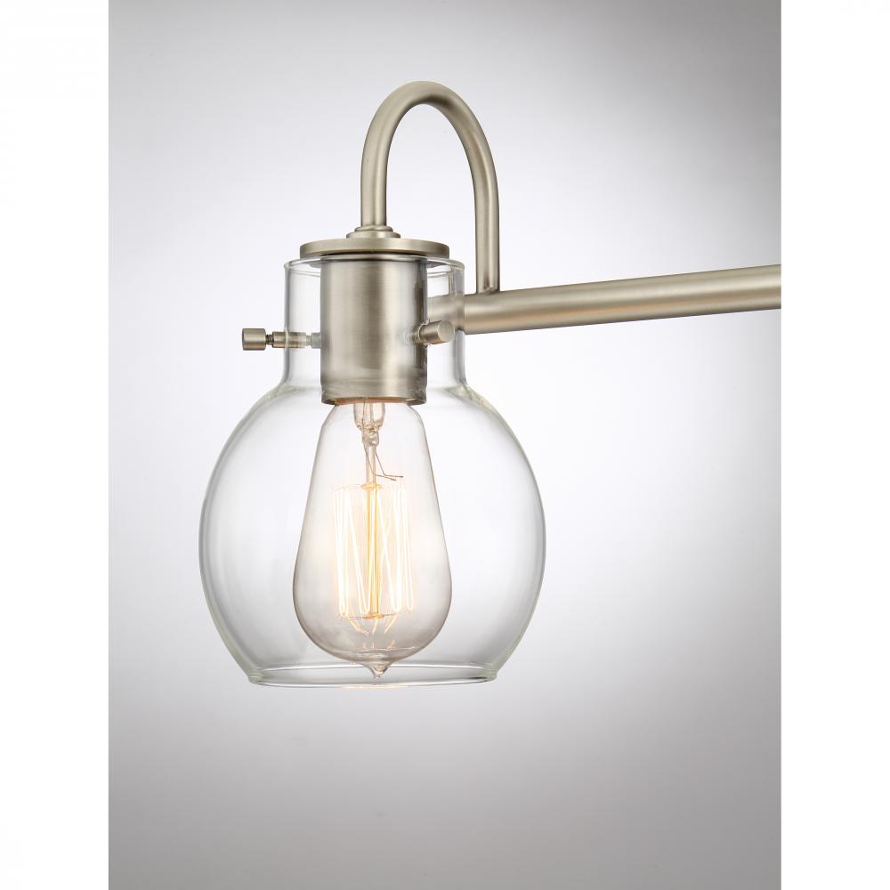 The ageless style of the Andrews Bath Collection is synonymous with classic industrial design. The clear glass shades encircle the sockets and appear as though they are floating over the vintage filament bulbs. The Antique Nickel finish on the fixture b