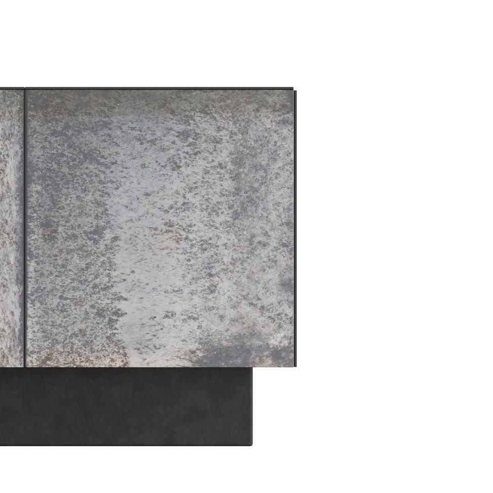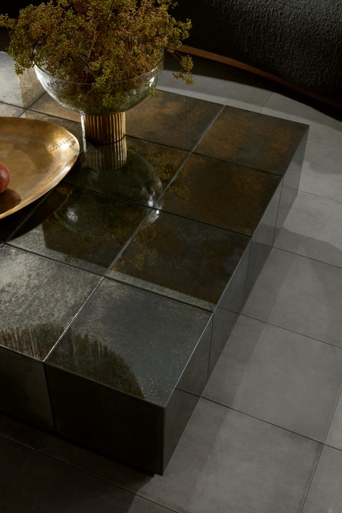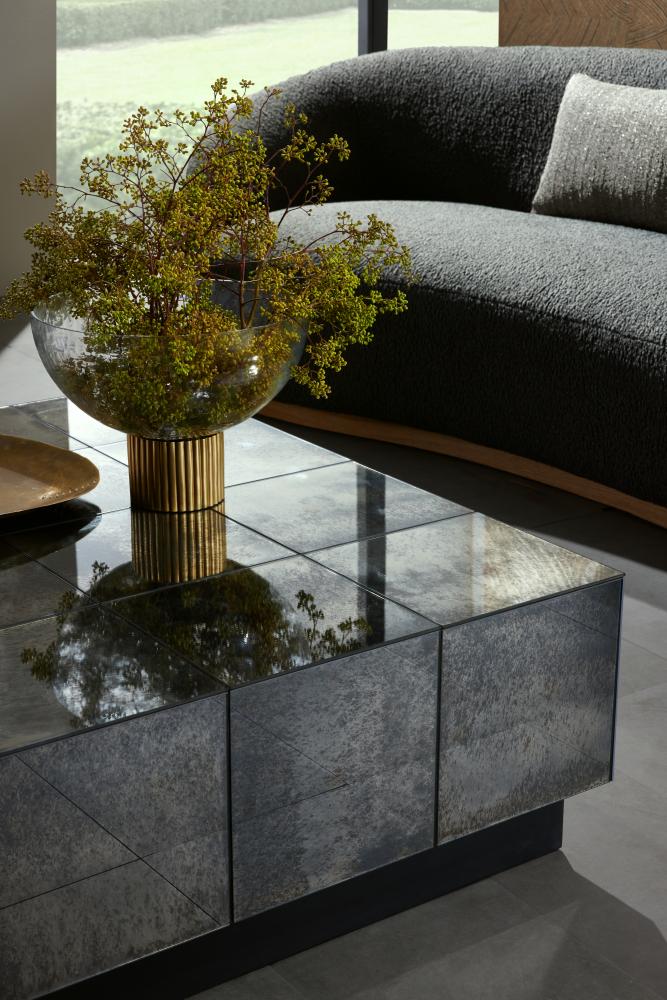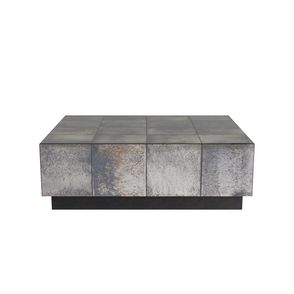 The vintage allure of watercolor design inspired the finish of our antiqued-finished coffee table. The top and sides are wrapped around in a grid pattern floating on a bronzed iron base. Antiquing willv vary.