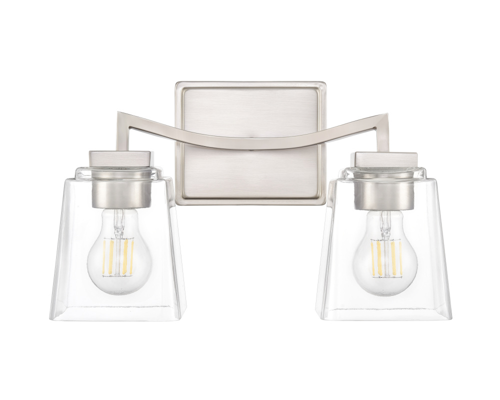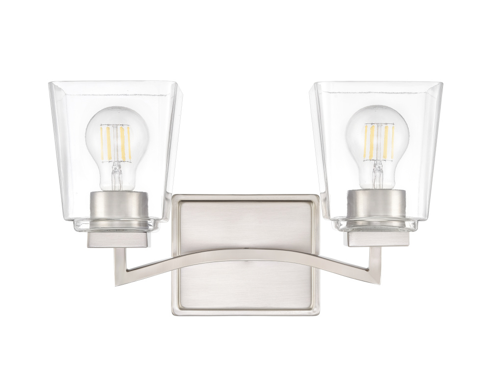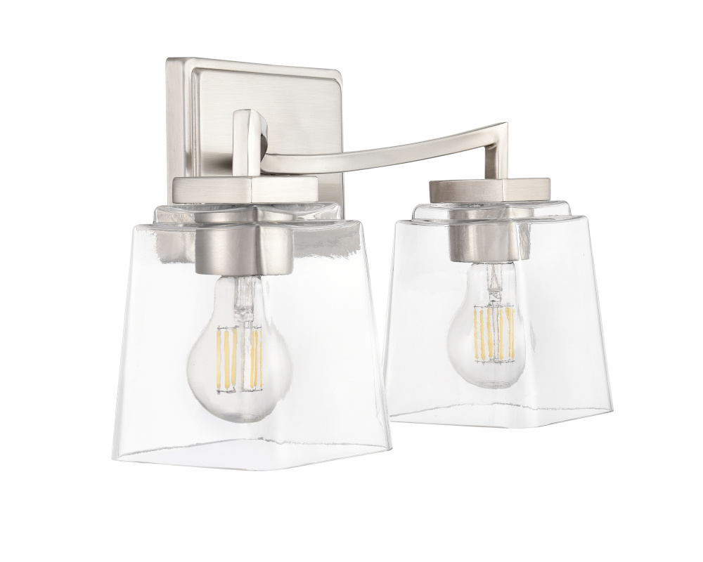 Sleek arced lines and unique square-shaped, clear glass globes infuse the Avenna Family of vanity lighting with a dynamic sense of motion and an elegant flair. Finished in modern gold, polished nickel, matte black, or brushed nickel these exquisite fixtures are available in 2- or 3-light options. Perfect for any interior design scheme, these vanity lights transform any bath space with a bold and sumptuous design statement.