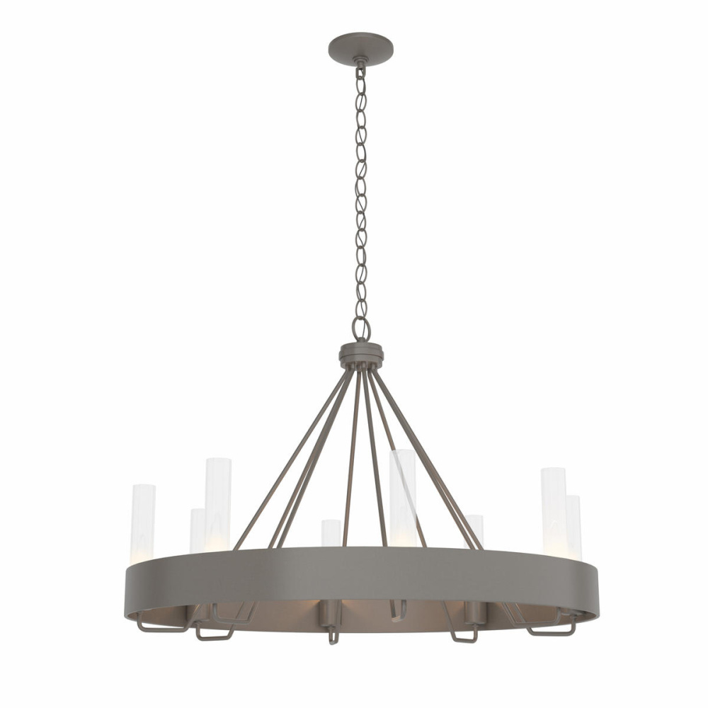 As at home in a modern lodge with exposed beams, as in a contemporary city loft, the Banded Ring Chandelier is far-reaching in its appeal. Clean lines radiate upward from a wide steel band, as candelabra bulbs warmly illuminate within 8 glass cylinders. Available in clear or opal glass options.