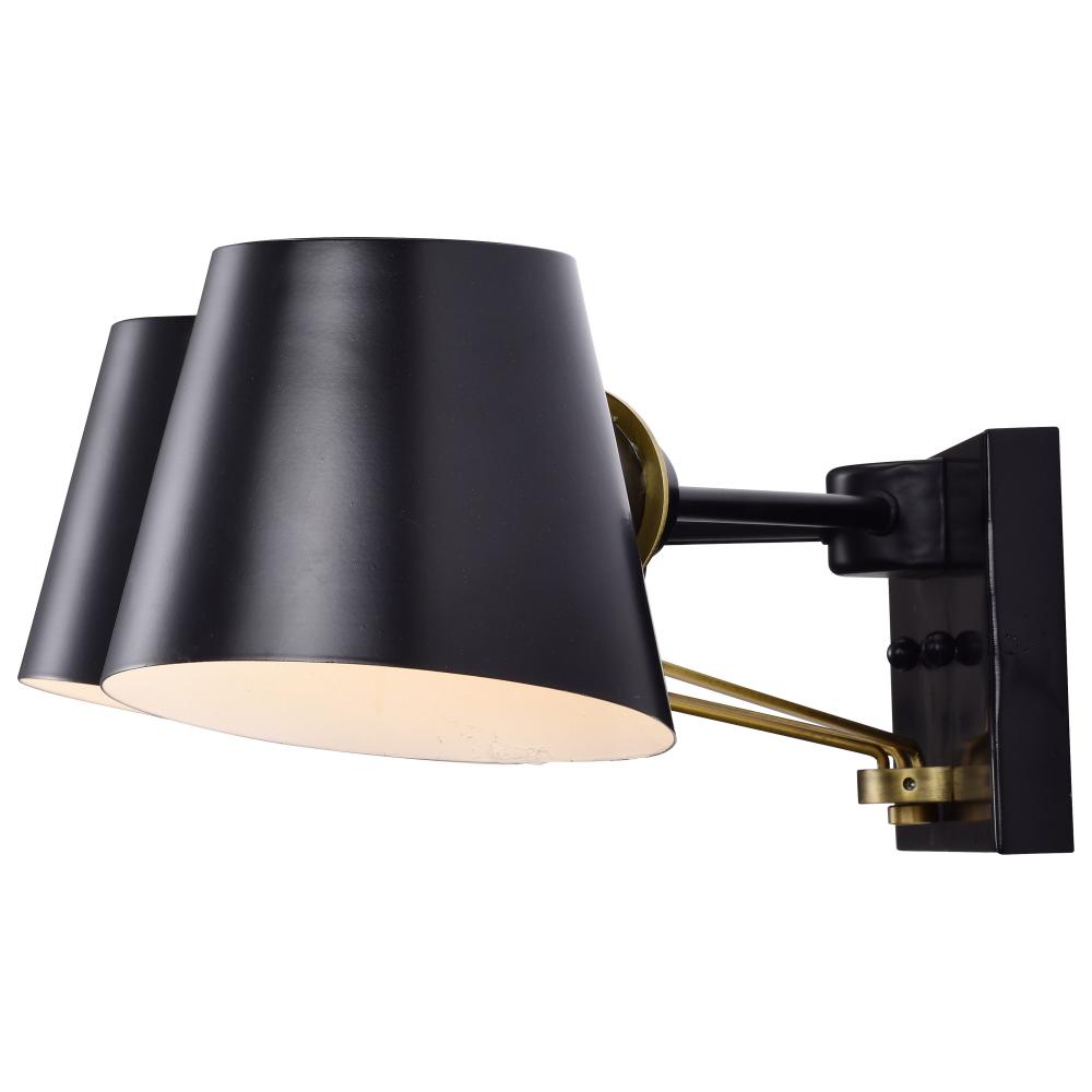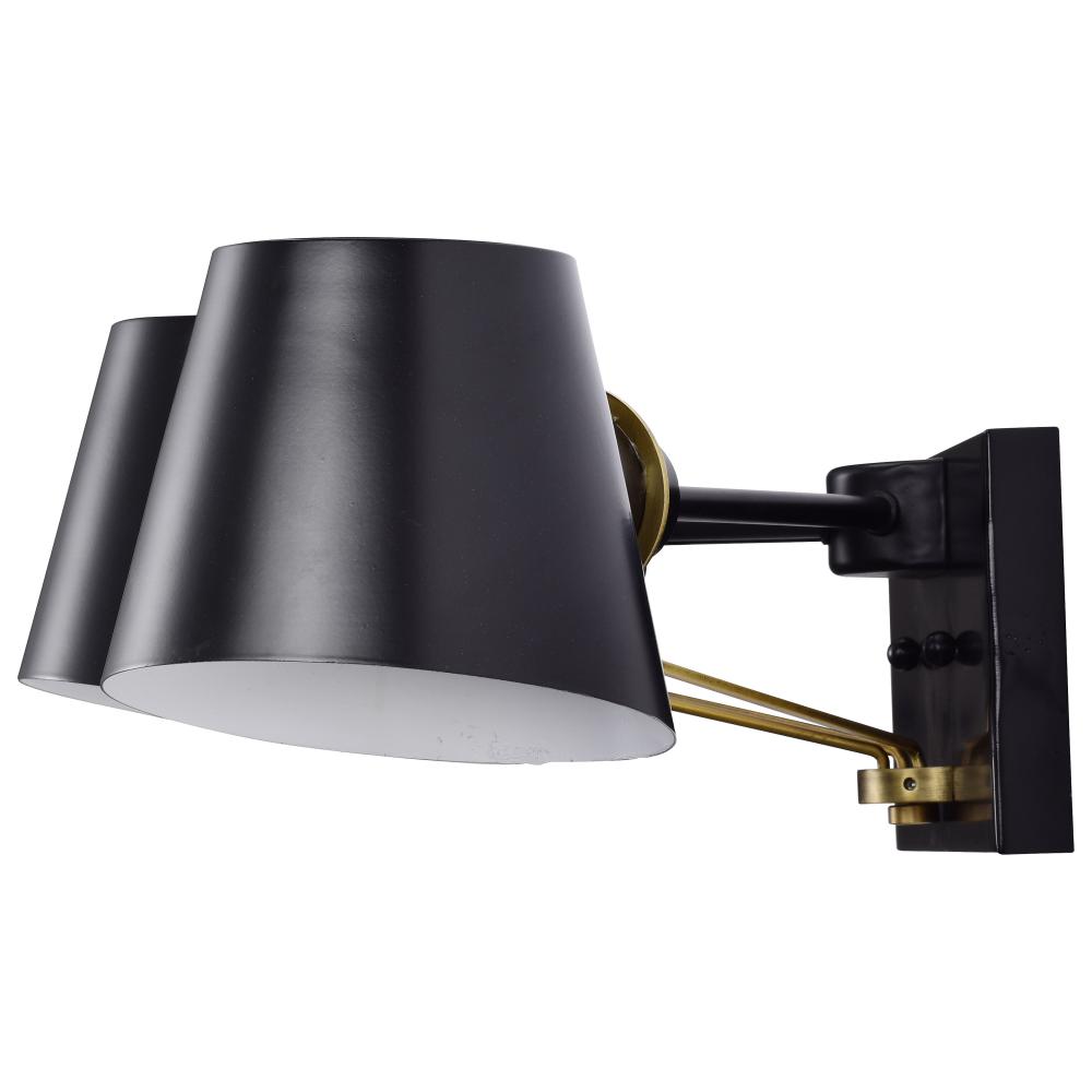 Finished in black with burnished brass accents and matching metal shades