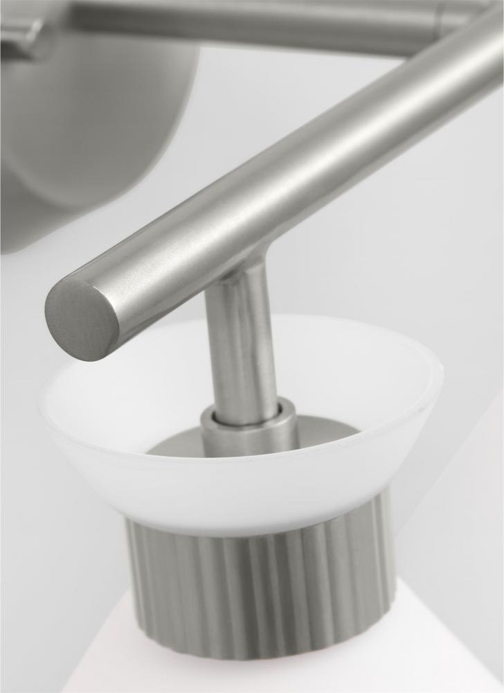 Inspired by playful mid-century modern design, the Drew & Jonathan Belcarra Two Light Wall / Bath Sconce is accentuated by a flared glass shade with ribbed metal details and etched white glass that bestows an almost whimsical touch to the clean design. Available in three finishes, Brushed Steel, Midnight Black, and Satin Brass, the Belcarra looks great on its own or installed above a bathroom vanity. This fixture may be mounted in the up or down position, and is cETL listed for damp locations, making it the perfect lighting solution for any space.