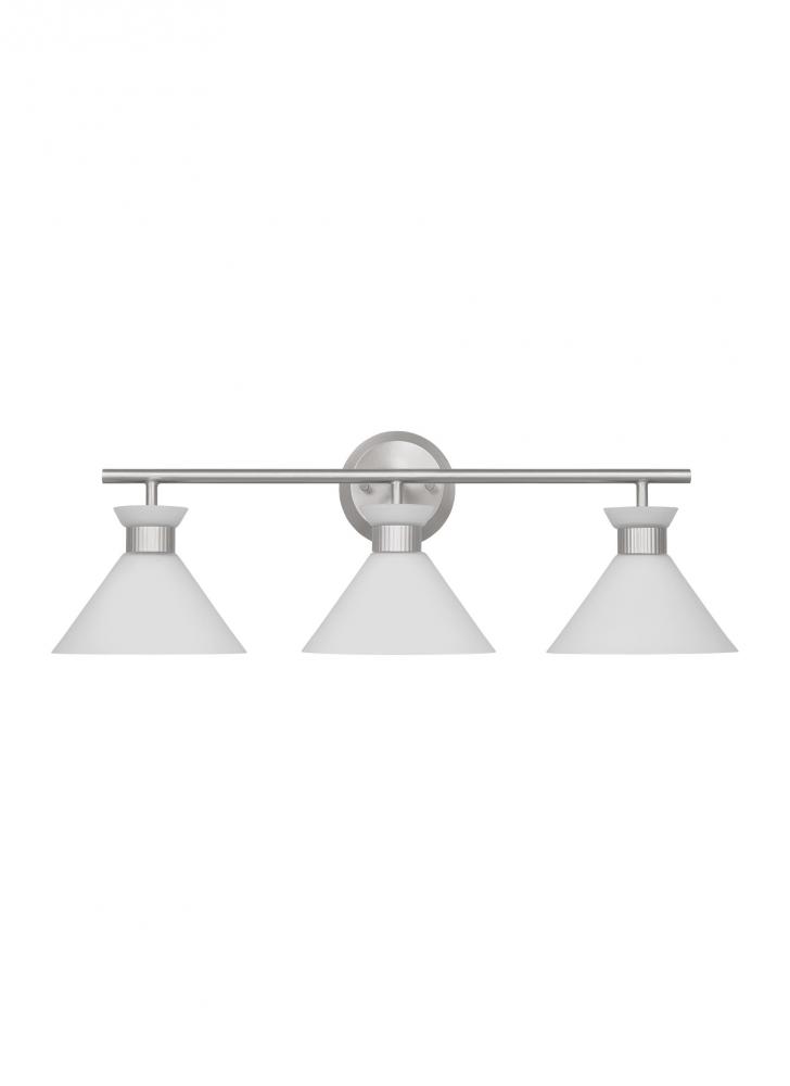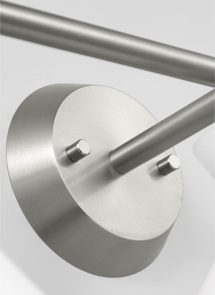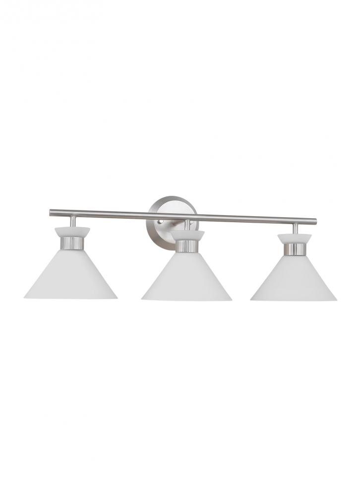 Inspired by playful mid-century modern design, the Drew & Jonathan Belcarra Three Light Wall / Bath Sconce is accentuated by a flared glass shade with ribbed metal details and etched white glass that bestows an almost whimsical touch to the clean design. Available in three finishes, Brushed Steel, Midnight Black, and Satin Brass, the Belcarra looks great on its own or installed above a bathroom vanity. This fixture may be mounted in the up or down position, and is cETL listed for damp locations, making it the perfect lighting solution for any space.