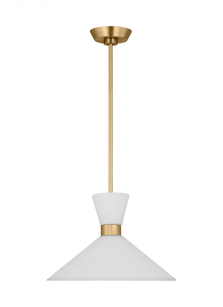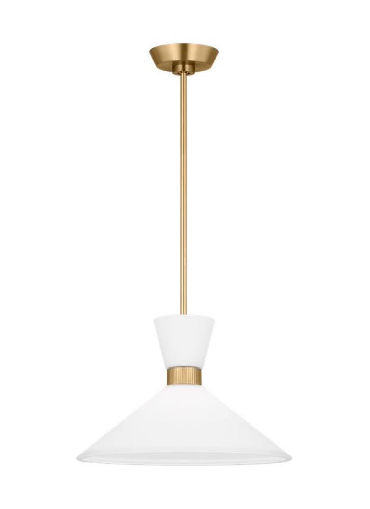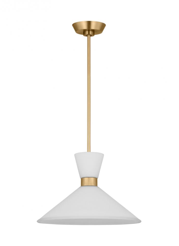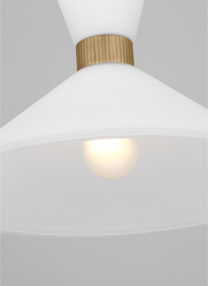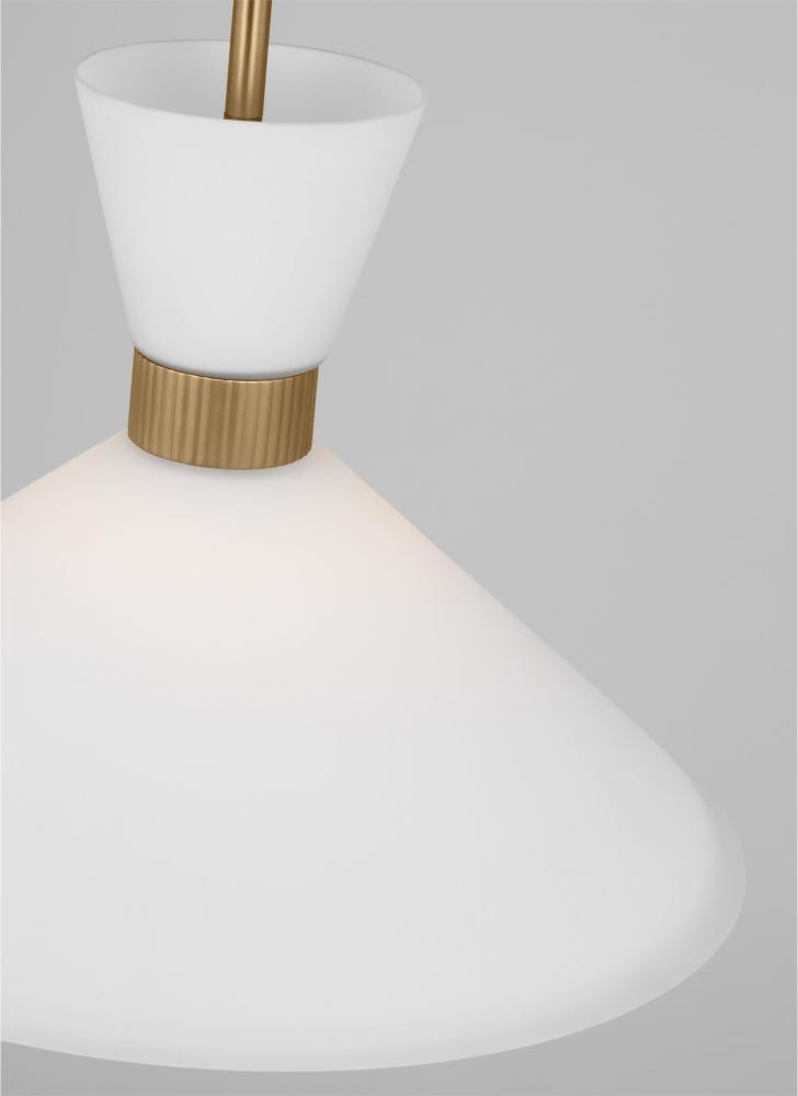 Inspired by playful mid-century modern design, the Drew & Jonathan Belcarra Medium Pendant is accentuated by a flared glass shade with ribbed metal details and etched white glass that bestows an almost whimsical touch to the clean design. Available in three finishes, Brushed Steel, Midnight Black, and Satin Brass, the Belcarra looks great on its own or when grouped in multiples. This product may be mounted on a sloped ceiling and is cETL listed for damp locations, making it the perfect lighting solution for any space.