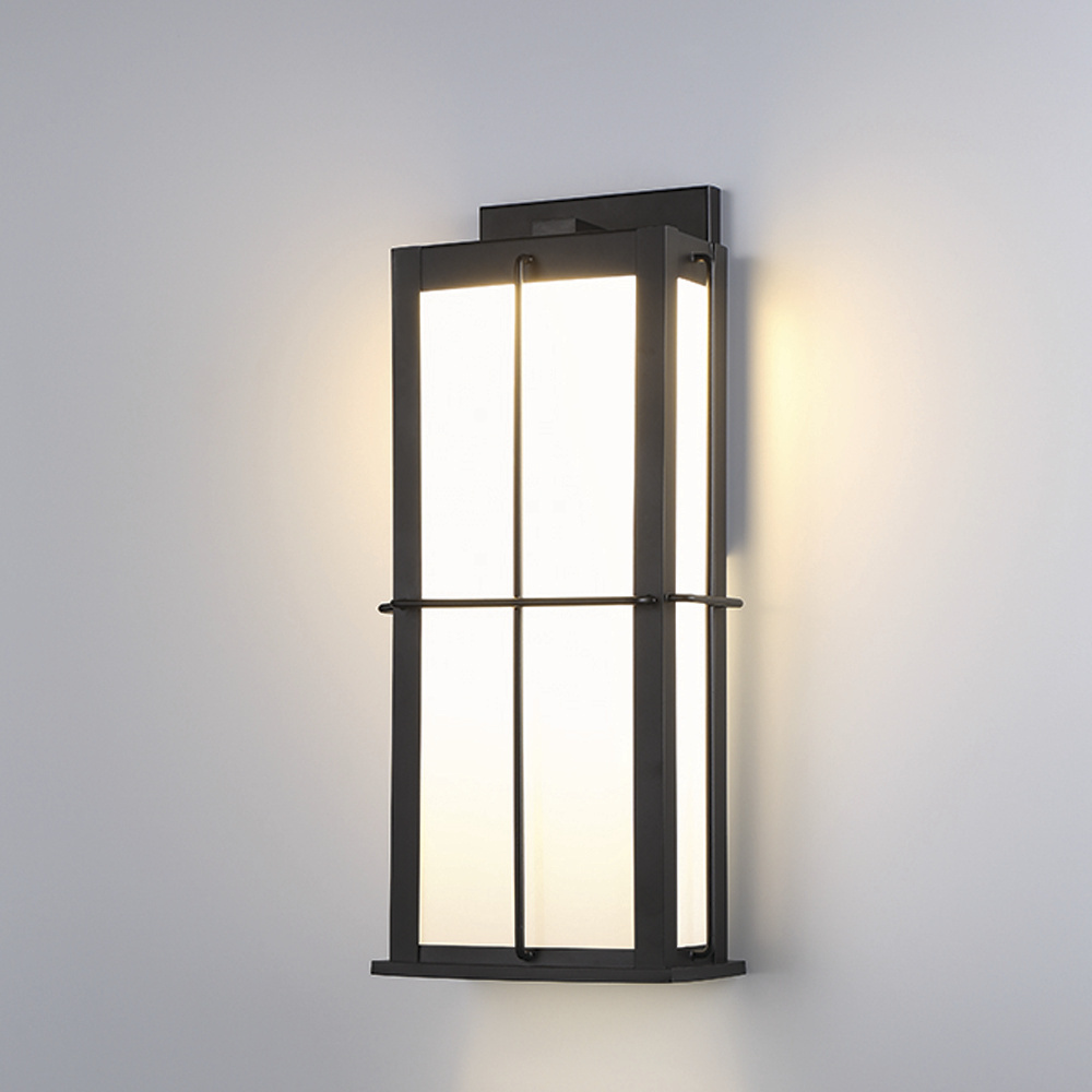 A delicate, rich black metal frame encases four opal glass panels, reminiscent of the shape of a bento box. This fixture emits a soft even glow for bright yet approachable illumination.