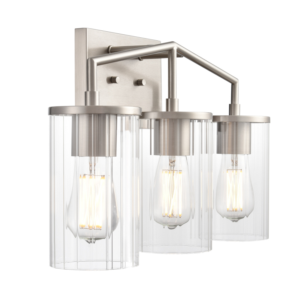 Artistic angles and a contemporary blend of metal and glass elevate the Beverlly Family of lighting to the next level. The distinctive lines of the fixtures, finished in brushed nickel, modern gold, or matte black, create the perfect framework for the beautifully beveled, clear glass globes. Available as 1-light pendant; 3- or 5-light chandelier; and 1-, 2-, 3-, or 4-light vanity, these fixtures add a subtle refinement throughout any home design.