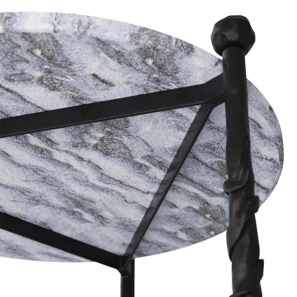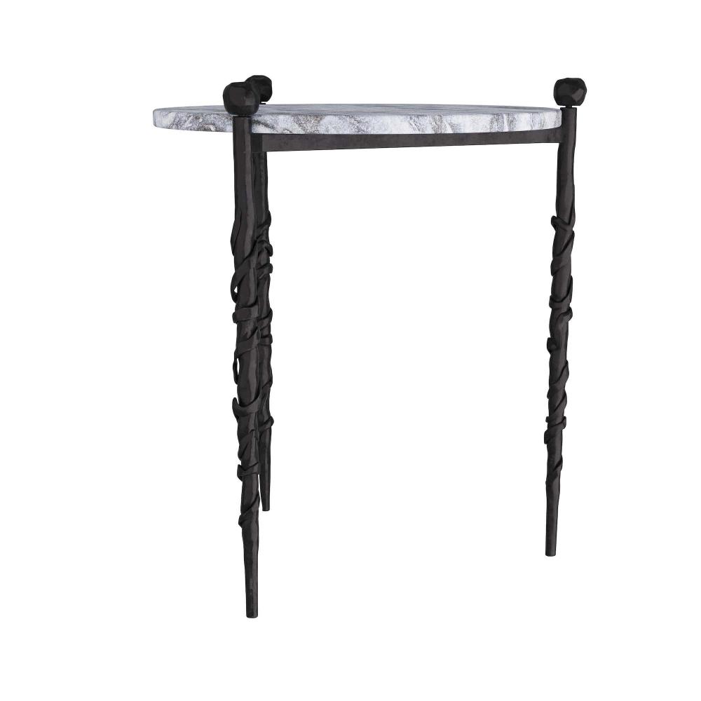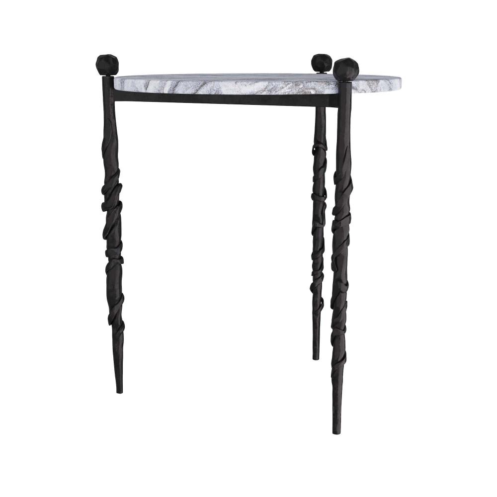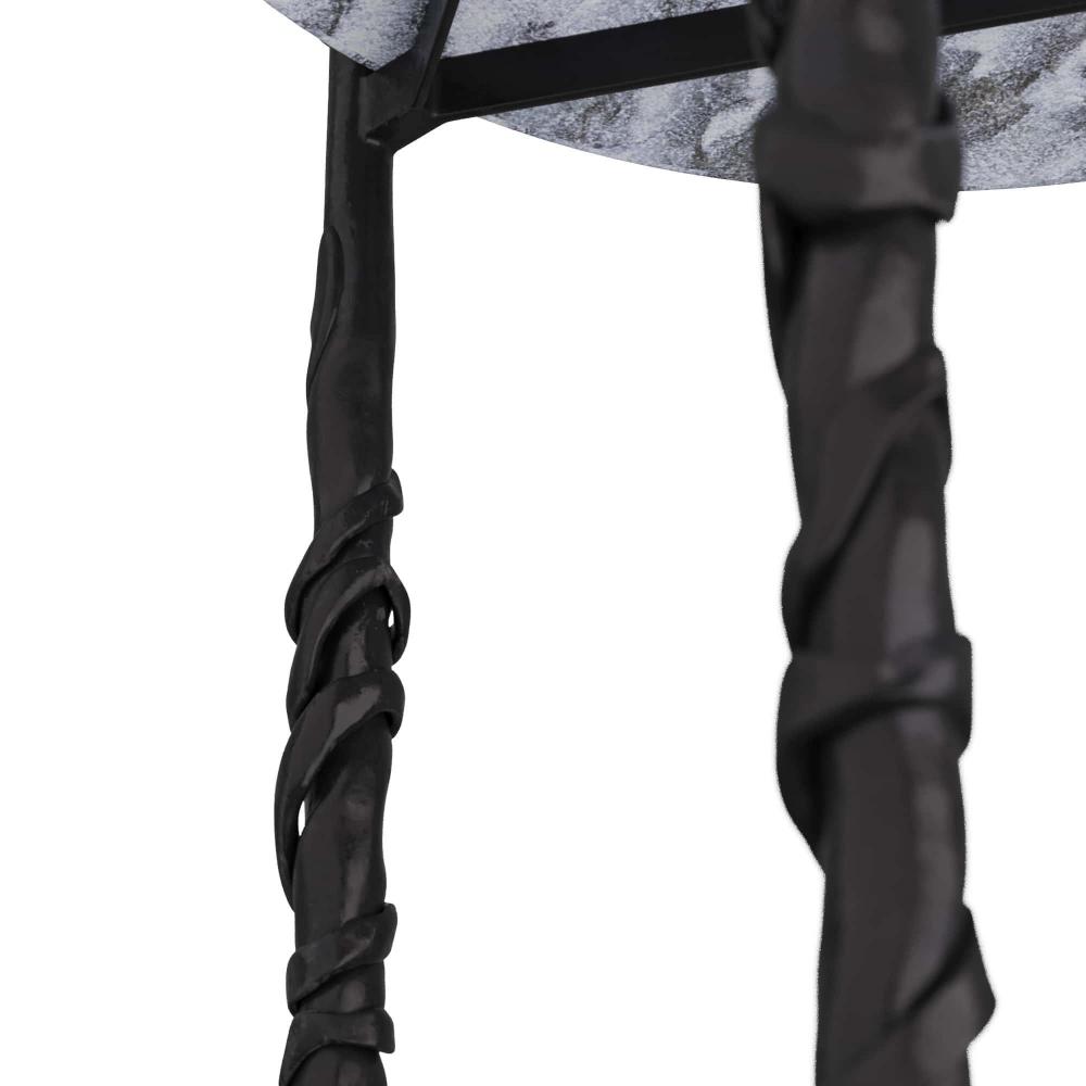 INSPIRED BY A GNARLED WOOD WALKING STICK THAT BELONGED TO MY GRANDFATHER, THE BLACKENED IRON LEGS OF THIS TABLE ARE ORGANIC AND UNIQUE JUST LIKE THE GALAXY MARBLE TOP. USE AS A SIDE TABLE OR A TEA TABLE IN FRONT OF A SOFA. FINISH WILL VARY.