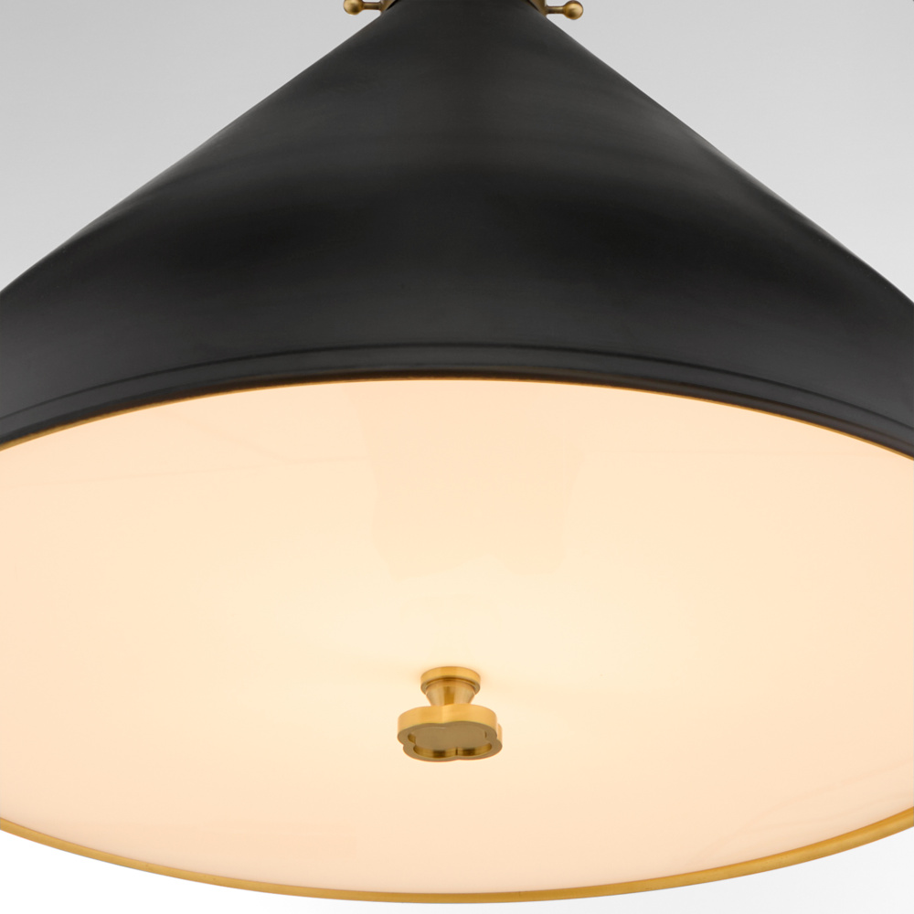 Tamara Day's signature "laid-back luxe" style shines through in the Bonnell collection, where traditional charm meets modern design. Thoughtfully crafted details like the clover finial, refined trim work, and sleek chain bring this series an extra layer of sophistication. The clean angles and unique shape add a contemporary edge. Finished in matte black with aged brass accents, the Bonnell collection is perfect as a single statement piece or a striking pair over a kitchen island.
