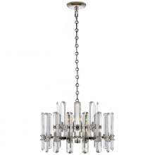 Inspired by mid-century modern aesthetics, the Bonnington by AERIN showcases elongated crystals that add sparkle and style. Available in various sizes and metal finishes, whether suspended from a stylized chain or mounted on a wall, it brings an elegant touch to smaller and medium-sized rooms, as well as hallways. The signature hand-cut crystals are meticulously arranged to enhance any space with timeless glamour.