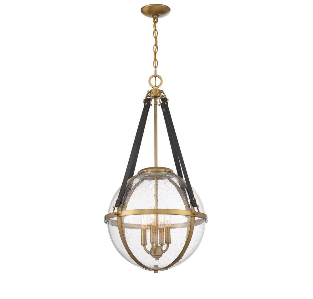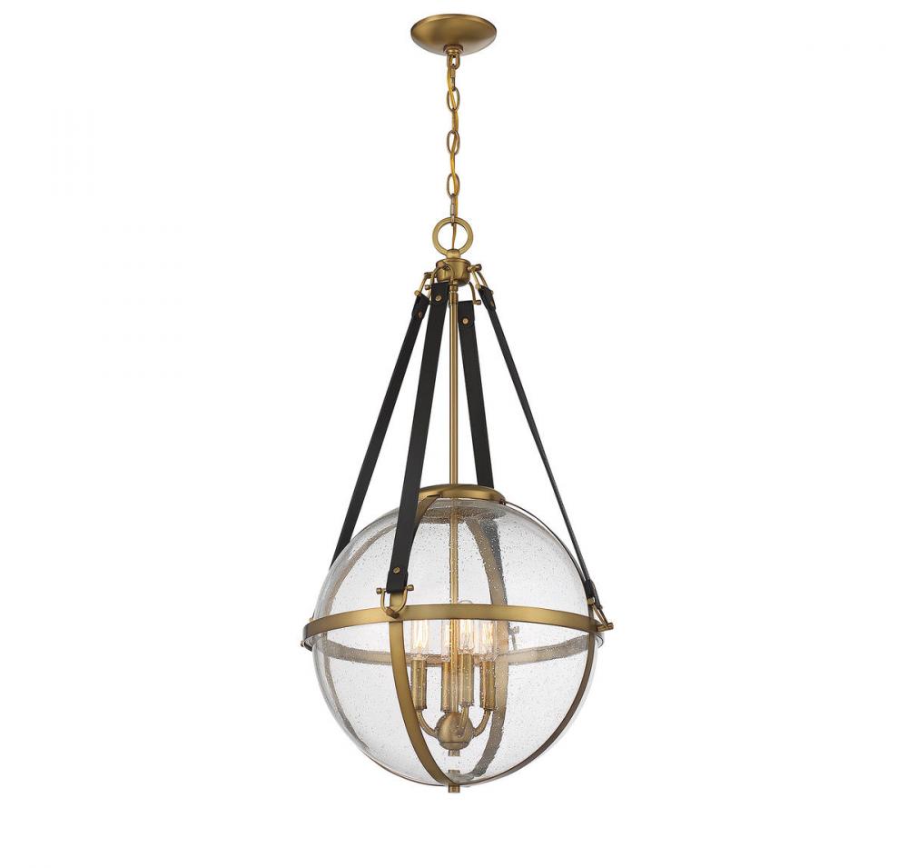 The Savoy House Bozeman 4-light pendant is a design that brings a touch of refined, equestrian-inspired style to your home. A seeded glass orb is held in place with straps of chocolate leather that pair perfectly with the warm brass finish. Bozeman is 32.5" in height and 18" in width. It uses four candelabra size bulbs of up to 60 watts per bulb. Comes with 120" of chain and 144" of cord.
