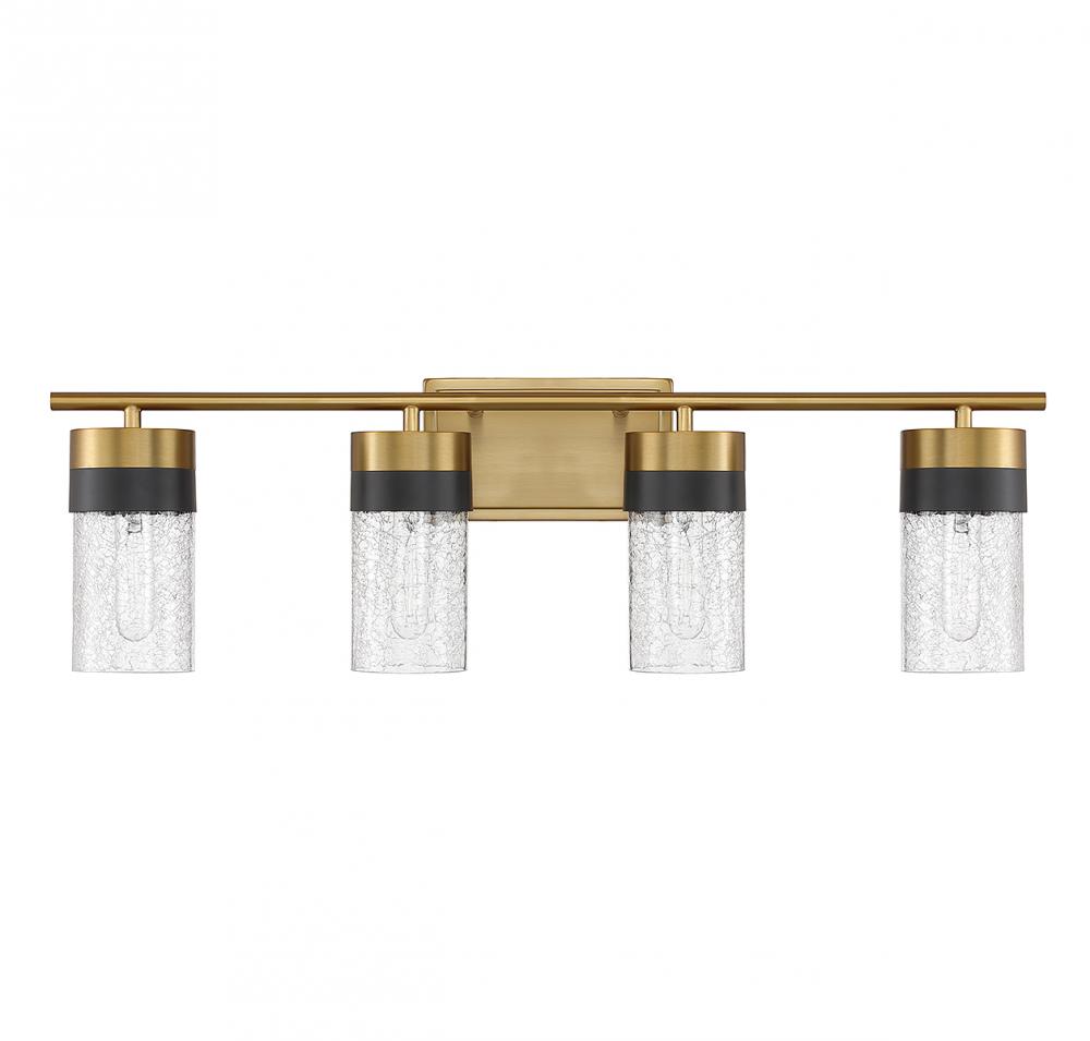 From top to bottom, the Savoy House Brickell 4-light bath vanity light is designed to make any bathroom a standout space. Its classic pairing of warm brass and black is made even better with the addition of textural clear crackled glass shades. Brickell is 8.75" in height, 30" in width and extends 5" from the wall. It uses 4 standard size bulbs of up to 60 watts per bulb (bulbs not included).