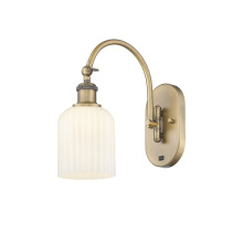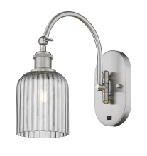 the arm swivels side to side at the base and the solid brass 180 degree adjustable swivel at the top of the socket has internal teeth that lock in at 5 degree intervals and allows for up and down tilting of the shade