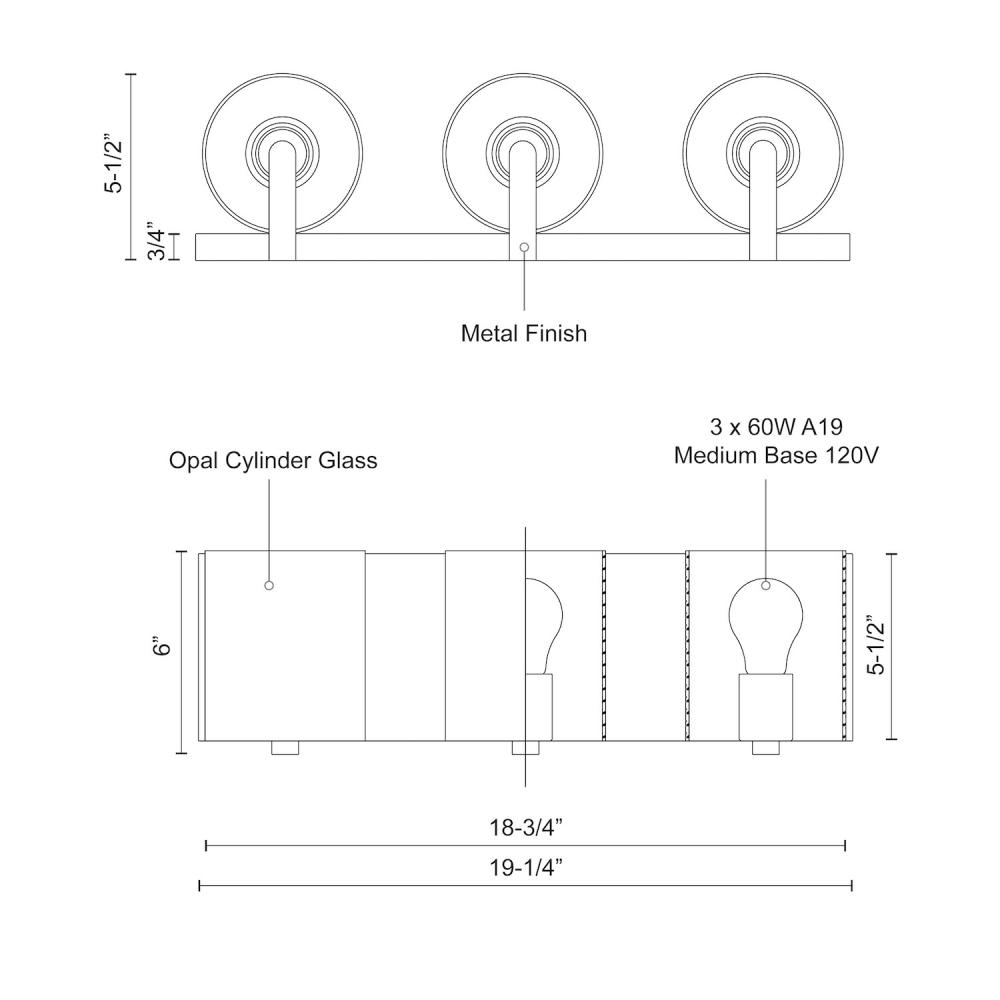 Three lamp vanity with white opal cylinder glass with your choice of brushed nickel or chrome metal details.