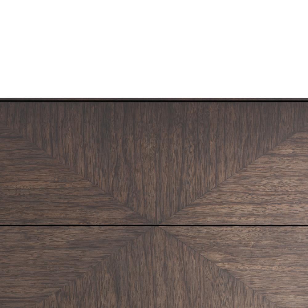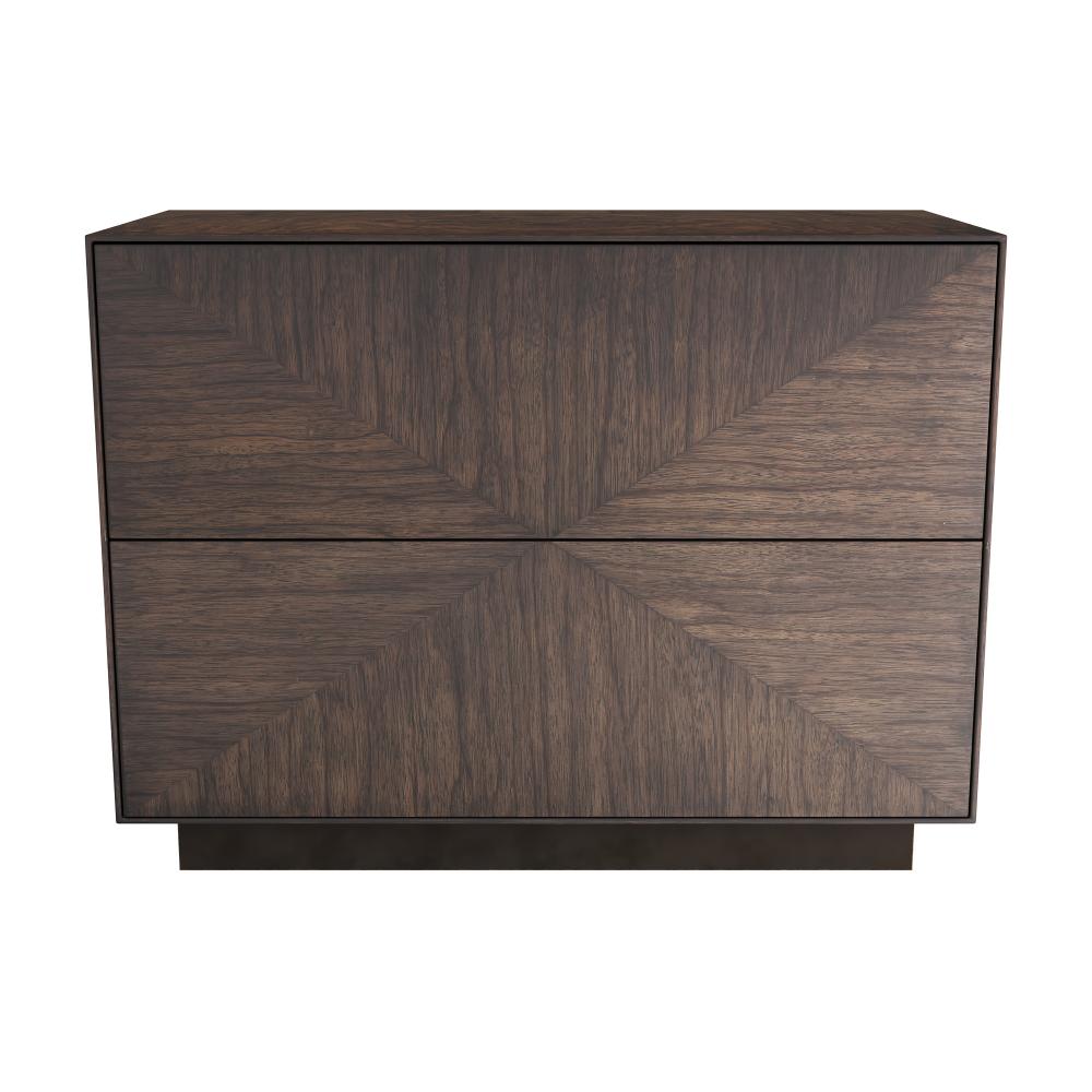 Adorned with a mitered grain pattern of ofram veneer in brindle, this classic cube end table recalls the best of '70s design. Dual soft-open drawers are activated with a delicate push. Both minimalist and modern.