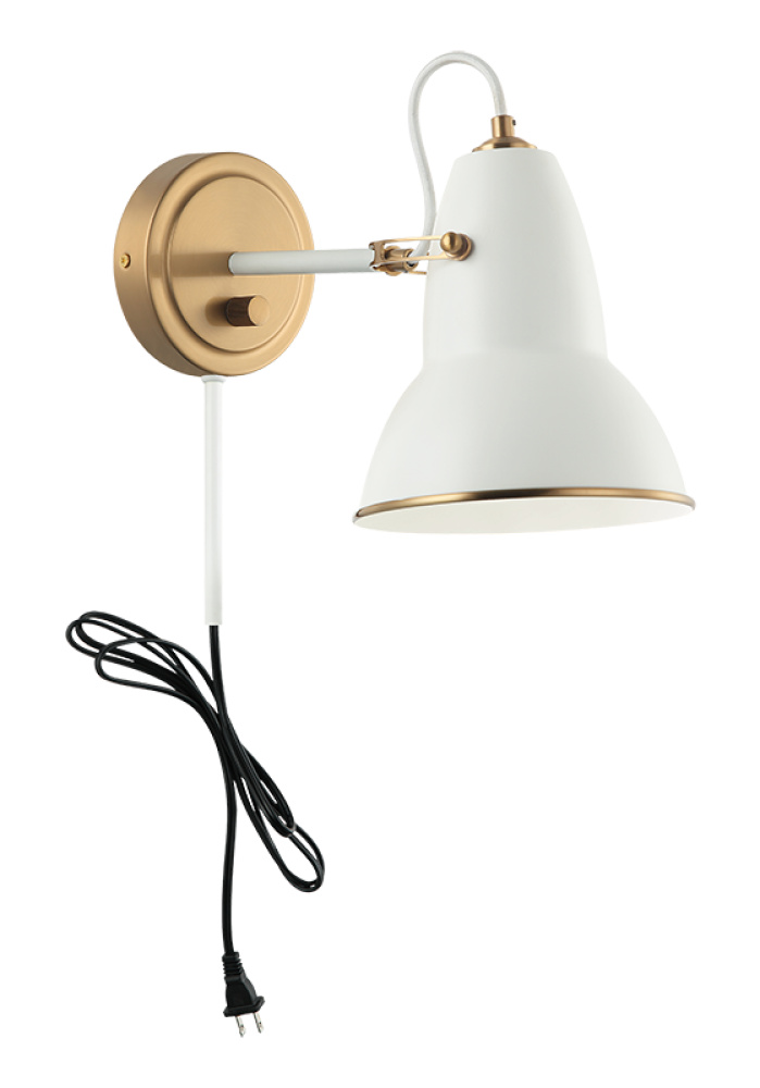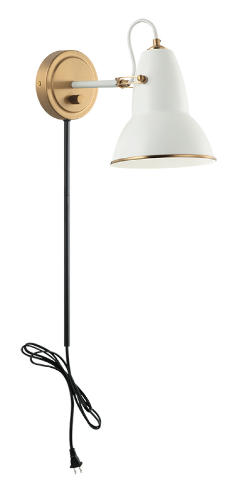 A playful yet sophisticated wall sconce collection. Designed with a dome shaped adjustable shade with Aged Gold Brass trim. This is extended with an adjustable arm. Features a built in dimmer, and available in 2 finish combinations and 2 sizes.