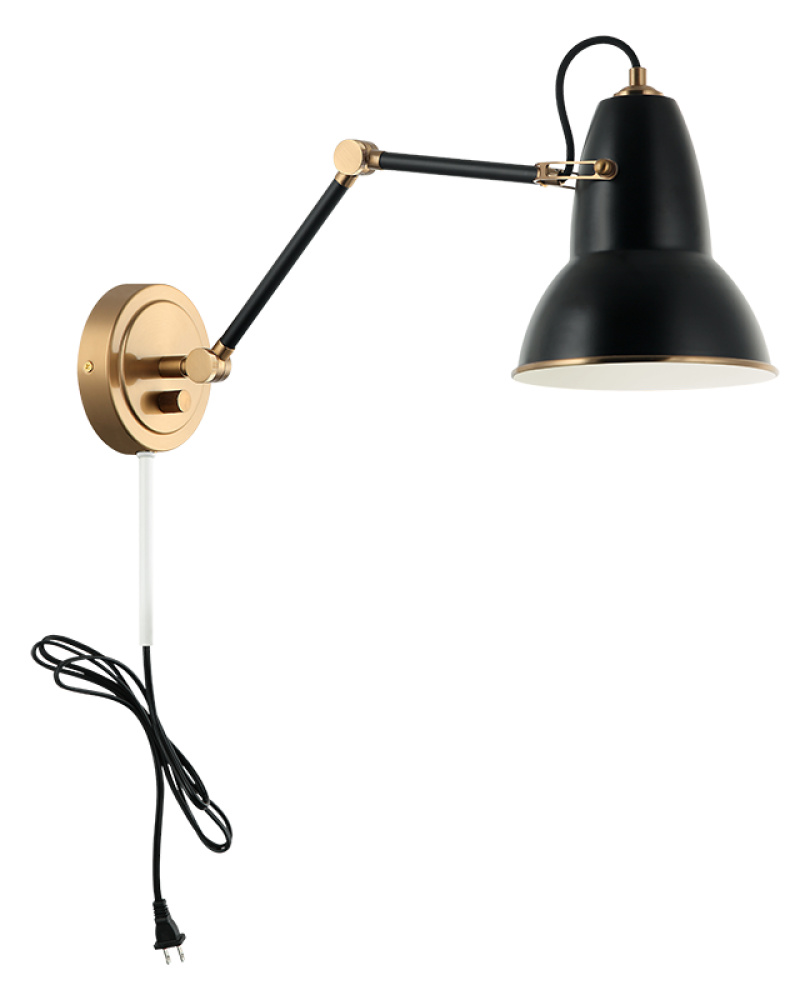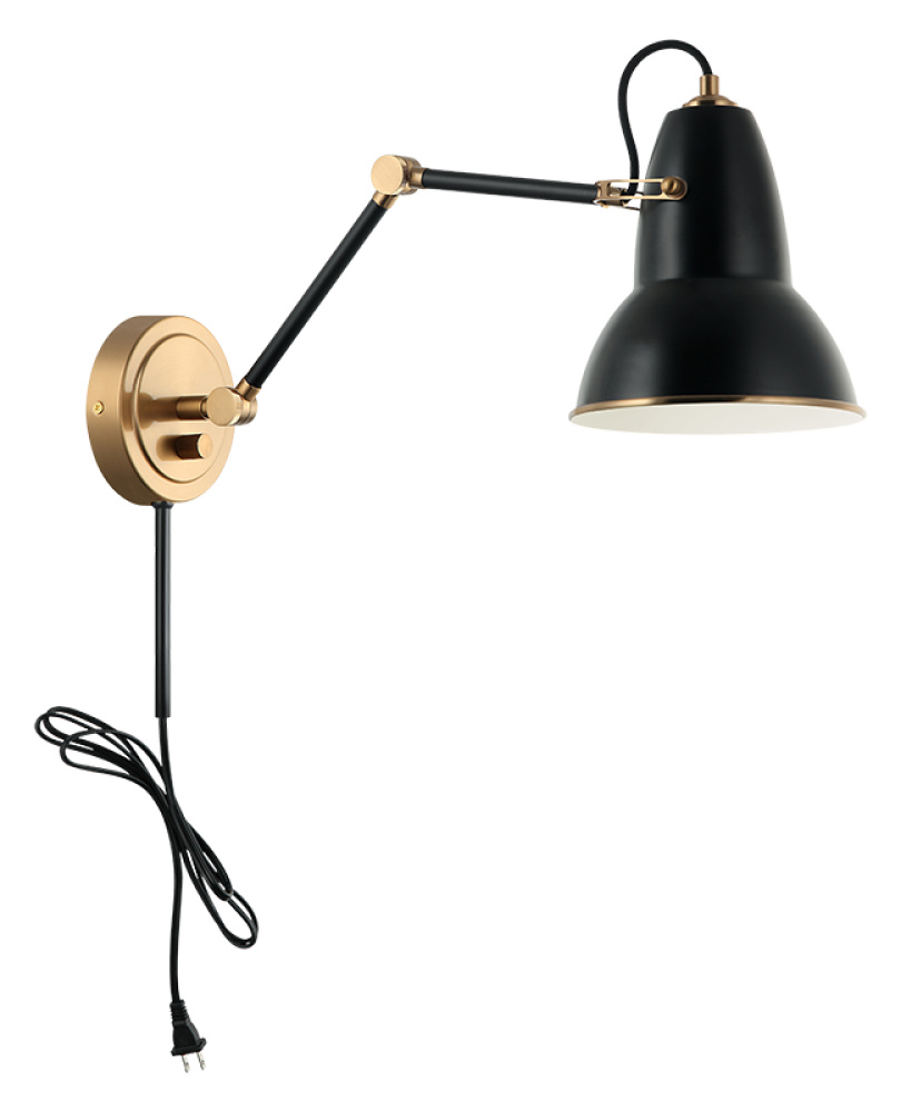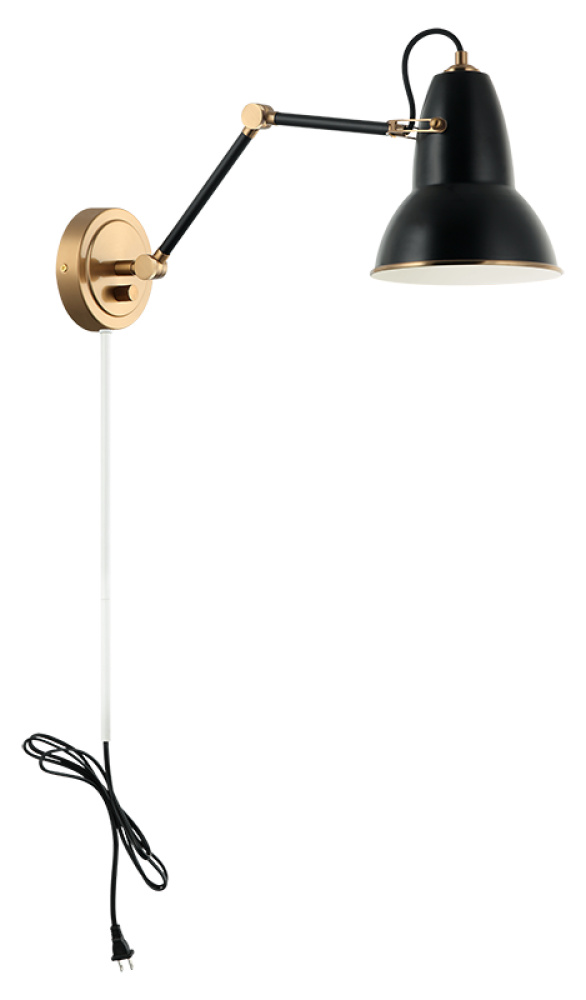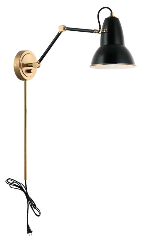 A playful yet sophisticated wall sconce collection. Designed with a dome shaped adjustable shade with Aged Gold Brass trim. This is extended with an adjustable arm. Features a built in dimmer, and available in 2 finish combinations and 2 sizes.
