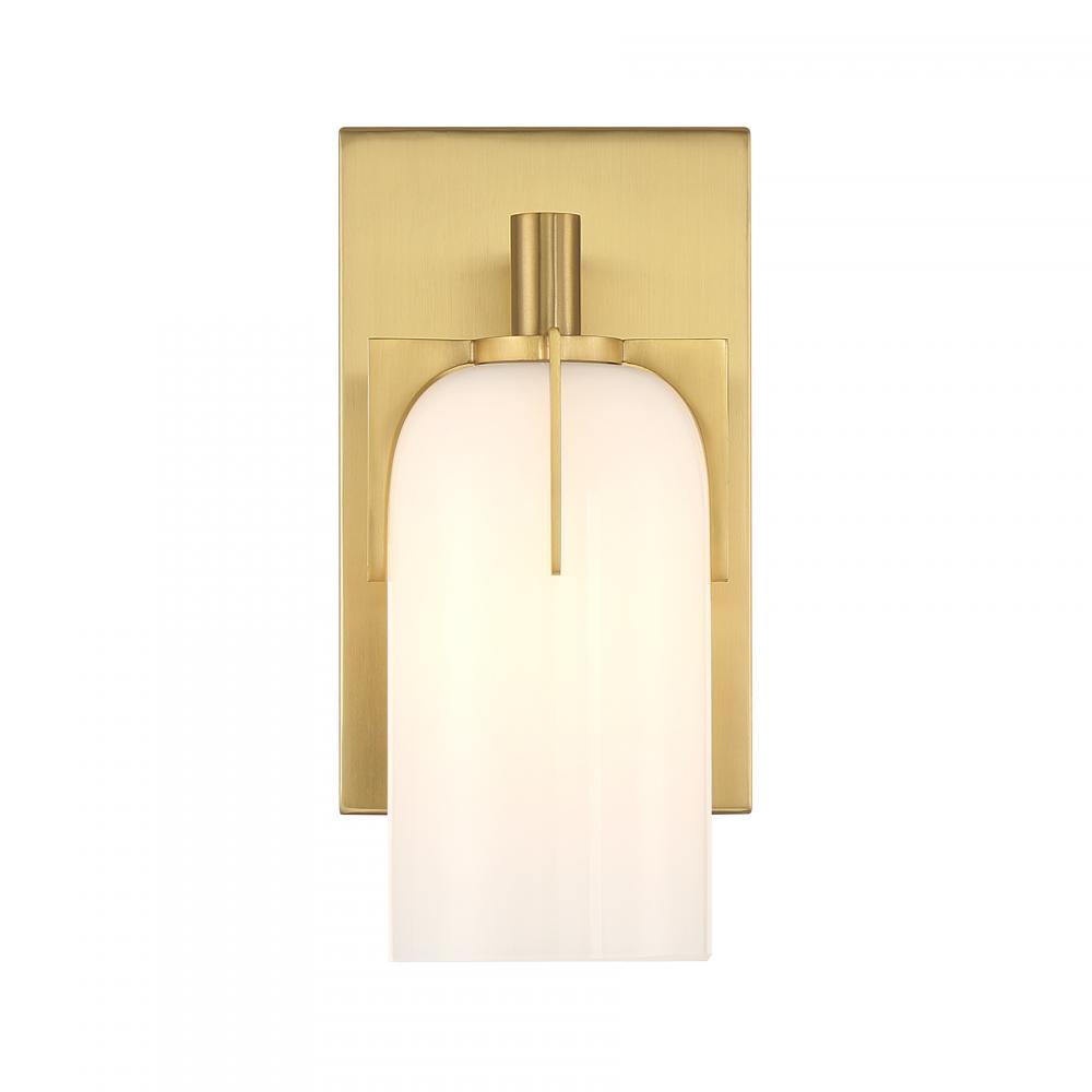Bring fashionable, vintage-inspired lighting home with the Savoy House Caldwell 1-light sconce. An etched white opal glass shade is held in place with dramatic jewelry-like prongs that are finished in Warm Brass. Caldwell is 9.5" in height, 4.75" in width and extends 5.5" from the wall. It uses one candelabra size bulb of up to 60 watts. The bulb is not included. This sconce is damp area rated and must be installed as shown.