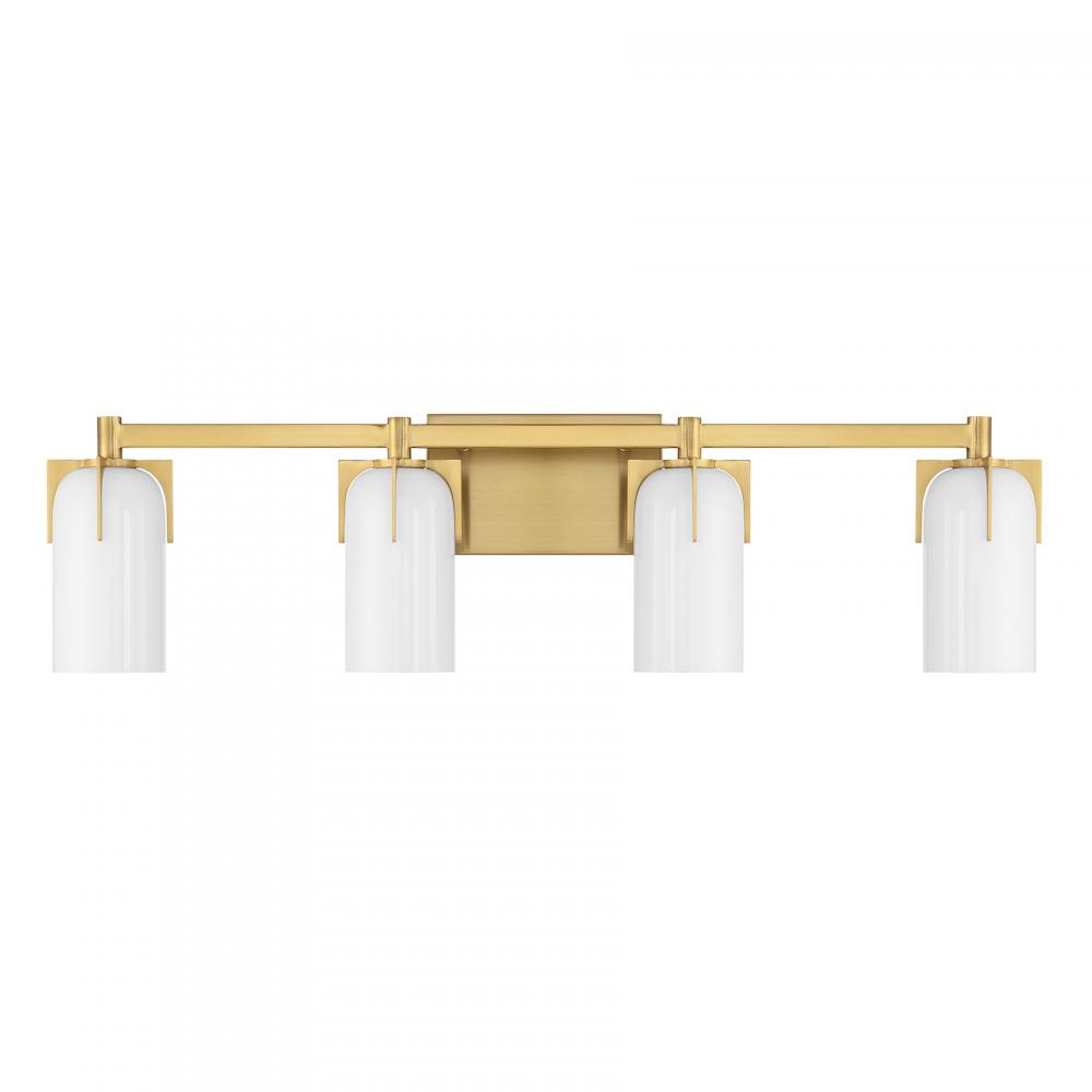 Bring fashionable, vintage-inspired lighting home with the Savoy House Caldwell 4-light bath bar. Etched white opal glass shades are held in place with dramatic jewelry-like prongs that are finished in Warm Brass. Caldwell is 8.5" in height, 32" in width and extends 5.5" from the wall. It uses four candelabra size bulbs of up to 60 watts per bulb. Bulbs not included. This bath light is damp area rated and must be installed as shown.