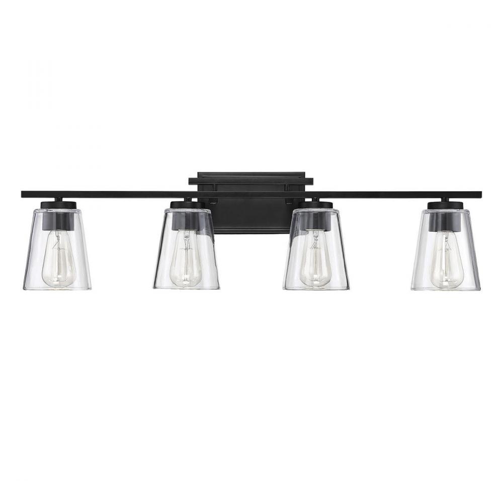 Brighten up your bathroom vanity with the sleek look of the Savoy House Calhoun 4-light bath bar. Its tapered clear glass shades and matte black finish make a perfect match. It may be mounted as either uplight or downlight. Bath bar lights are a classic choice for illuminating vanity mirrors in bathrooms big and small. Because the bulbs are exposed, try using stylized bulbs (not included) such as Edison for a different look! The matte black finish can be paired with black hardware or mixed with hardware in other fixtures. Calhoun is a smart choice for improving the lighting and look of any bathroom. When you choose a Savoy House lighting fixture, you can be certain you’ve selected a piece that will withstand the test of time.